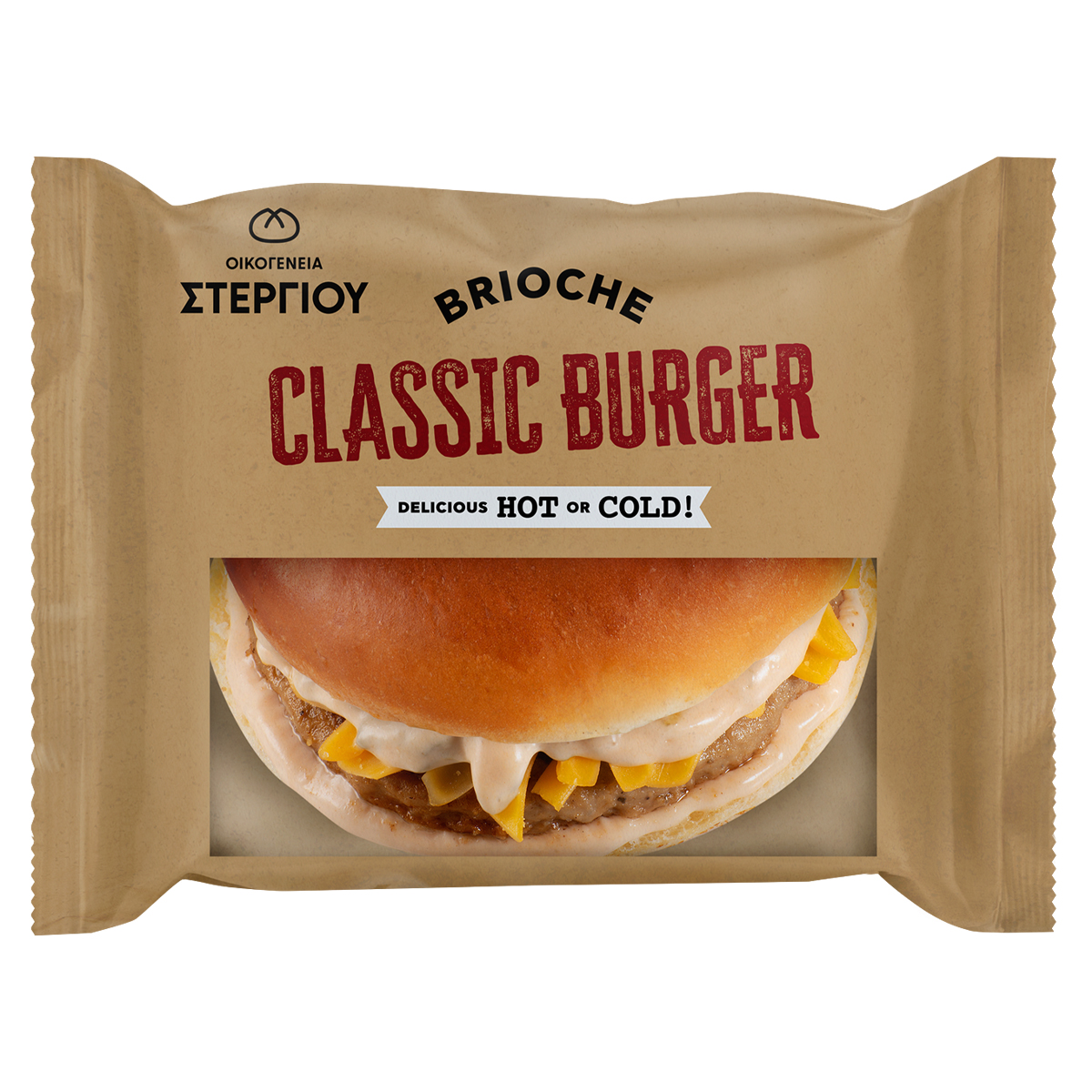 Σάντουιτς αποτελούμενο από αρτοσκεύασμα brioche, μπιφτέκι, τυρί τσένταρ, σάλτσα pink tartar και σάλτσα burger.