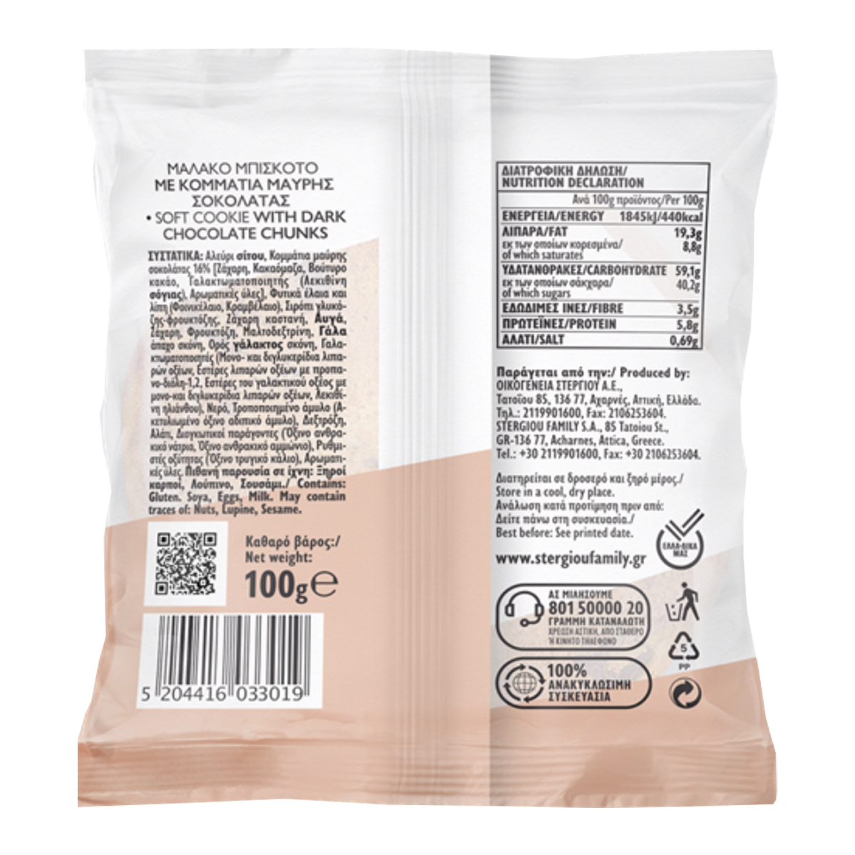 Τα Soft Cookies αποτελούν μία κατηγορία μπισκότου από μόνα τους. Μαλακά, μαστιχωτά και απόλυτα γευστικά, αποτελούν το ιδανικό συνοδευτικό για οποιοδήποτε ρόφημα ή και μία απολαυστική βάση για παγωτό! Στο συγκεκριμένο μπισκότο έχουμε ακολουθήσει την κλασική συνταγή, χρησιμοποιώντας ολόκληρα κομμάτια μαύρης σοκολάτας σε μία λαχταριστή βάση μπισκότου. Χορταστικό, όσο πρέπει γλυκό και με ελαφριά αλατότητα που ισορροπεί τη σοκολάτα, το μπισκότο αυτό προτείνεται ως το ιδανικό γλυκό διάλειμμα για μέσα στην μέρα.