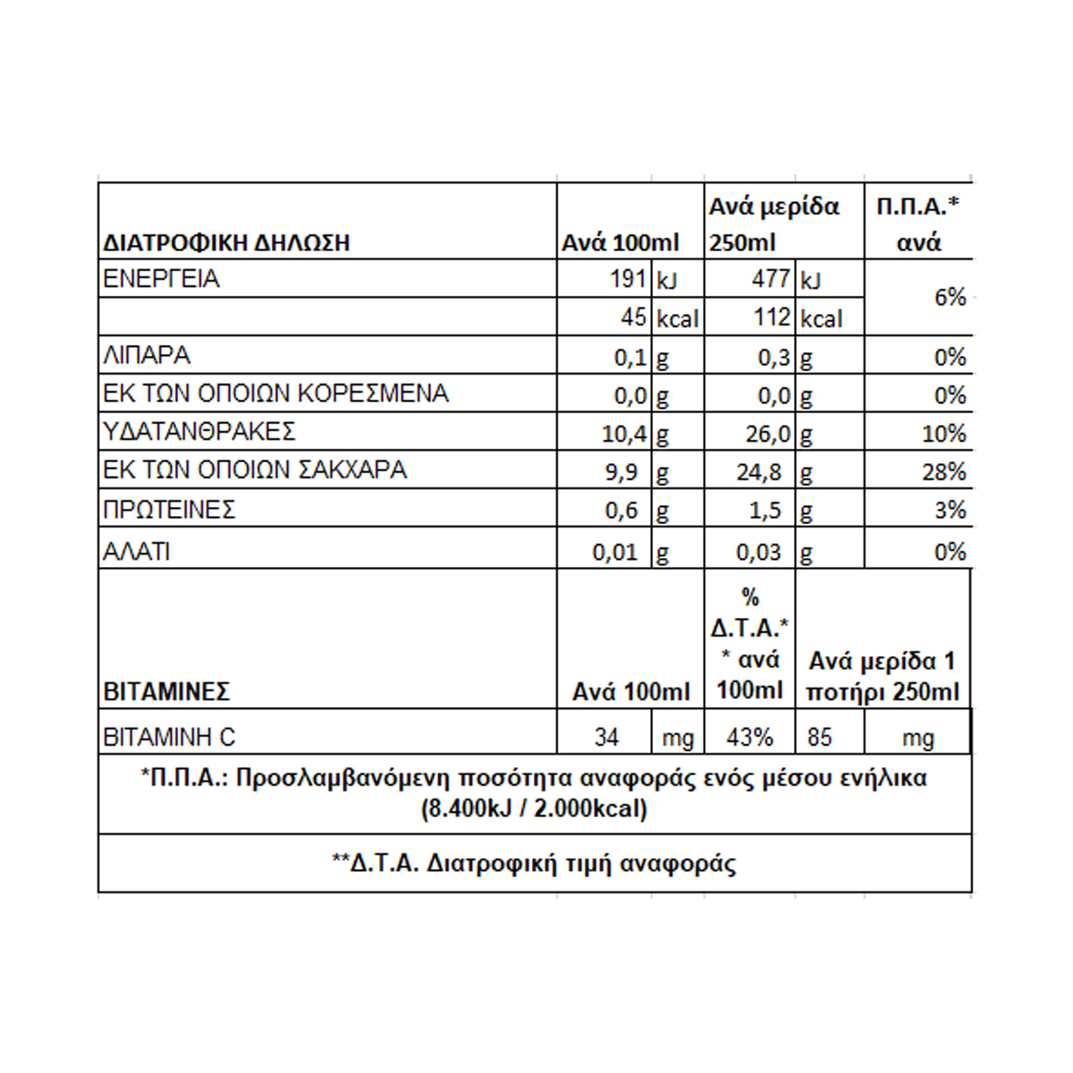 | Ενέργεια (ανά 100g) | 45 kcal |