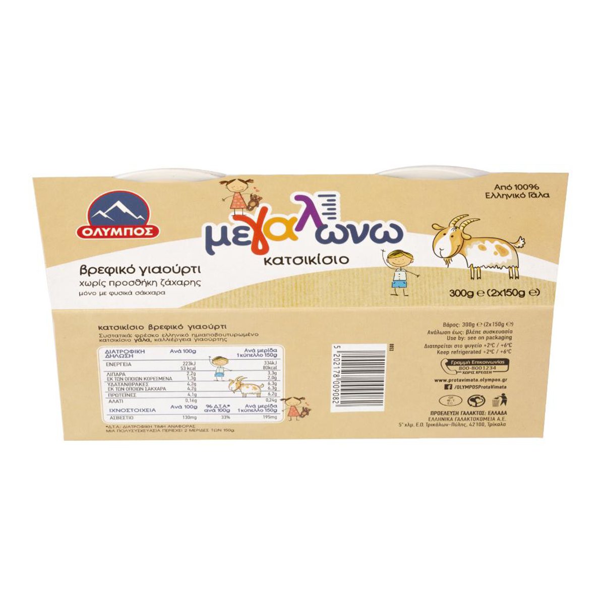 Το ΟΛΥΜΠΟΣ ΜΕΓΑΛΩΝΩ βρεφικό κατσικίσιο γιαούρτι είναι κατάλληλο για βρέφη από τον 6ο μήνα της ηλικίας τους. Παράγεται από 100% ελληνικό φρέσκο γάλα ΟΛΥΜΠΟΣ, έχει υπέροχη φυσική γεύση χωρίς προσθήκη σακχάρων και γλυκαντικών.