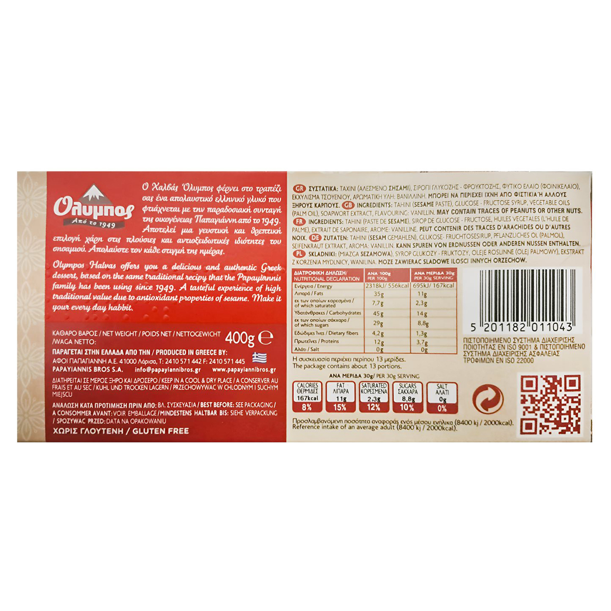 Ο χαλβάς “Όλυμπος” είναι ένα υπέροχο ελληνικό γλυκό που παράγεται από ταχίνι (αλεσμένο σουσάμι) και λευκή καραμέλα, συχνά και με προσθήκη ξηρών καρπών ή μελιού. Είναι ένα γλυκό με καθαρά φυτικά συστατικά και υψηλή θρεπτική αξία, ιδιαίτερα δημοφιλές στις παραδοσιακές νηστείες. Είναι όμως και το ιδανικό γλυκό μετά το γεύμα ή το δείπνο και με τον καφέ. Ο χαλβάς “Όλυμπος” είναι γευστικός, θρεπτικός, πλούσιος σε πρωτεΐνες και ασβέστιο που τον κάνουν άριστη, φυσική τροφή για όλους.