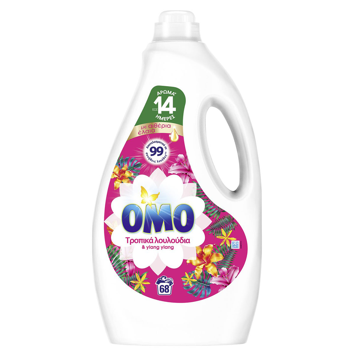 Το ΟΜΟ υγρό απορρυπαντικό για το πλυντήριο με Τροπικά Λουλούδια χαρίζει ένα άρωμα φρεσκοπλυμένου που διαρκεί έως και 14 ημέρες. Κάθε δόση χαρίζει εξαιρετική καθαριότητα, ενώ τα εμπλουτισμένα με αιθέρια έλαια αρώματα που περιέχει έχουν επιλεχτεί ειδικά για να σας προσφέρουν φρεσκάδα που διαρκεί όλη μέρα.