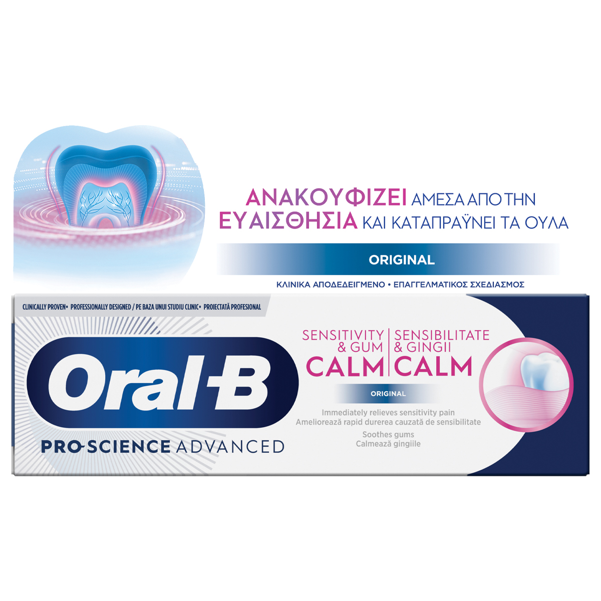 Η οδοντόκρεμα Oral-B Pro-Science Advanced Sensitivity & Gum Calm είναι κλινικά αποδεδειγμένο ότι ανακουφίζει άμεσα από την ευαισθησία και ανακουφίζει τα ούλα. Η μοναδική του τεχνολογία Activcalm ανακουφίζει άμεσα απο την ευαισθησία δημιουργώντας ένα στρώμα προστασίας. Δροσίζει τα ούλα κατά τη διάρκεια και μετά το βούρτσισμα, χαρίζοντας μεγάλη άνεση χάρη στον απαλό αφρό.