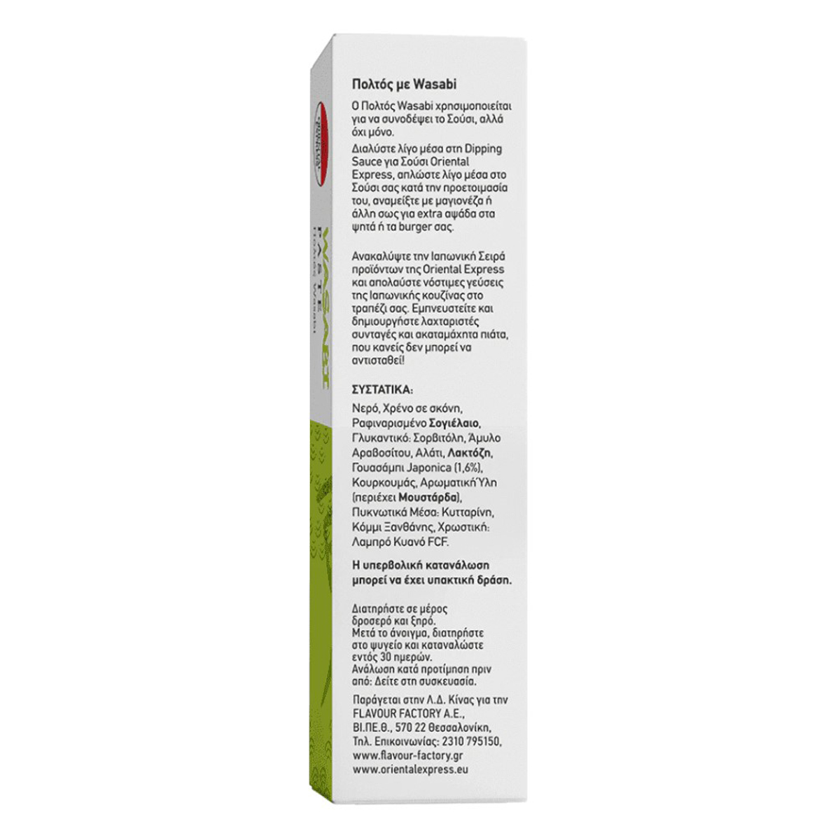 Νερό, χρένο σε σκόνη, ραφιναρισμένο ΣΟΓΙΕΛΑΙΟ, γλυκαντικό: σορβιτόλη, άμυλο αραβοσίτου, αλάτι, ΛΑΚΤΟΖΗ, Γουασάμπι Japonica (1,6%), κουρκουμάς, αρωματική ύλη (περιέχει ΜΟΥΣΤΑΡΔΑ), πυκνωτικά μέσα: κόμμι ξανθάνης, χρωστική: λαμπρό κυανό Fcf.