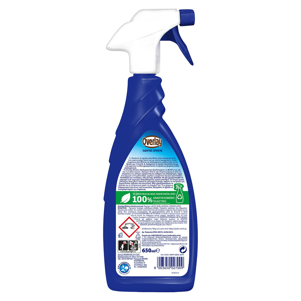Το Overlay Μπάνιο Απολυμαντικό εξουδετερώνει το 99,99% των ιών και των βακτηρίων. Αφαιρεί άλατα και επίμονη βρομιά από τις επιφάνειες του μπάνιου αφήνοντάς τες καθαρές και αστραφτερές. Χάρη στο άρωμα εσπεριδοειδών, χαρίζει ευχάριστο άρωμα φρεσκάδας.
