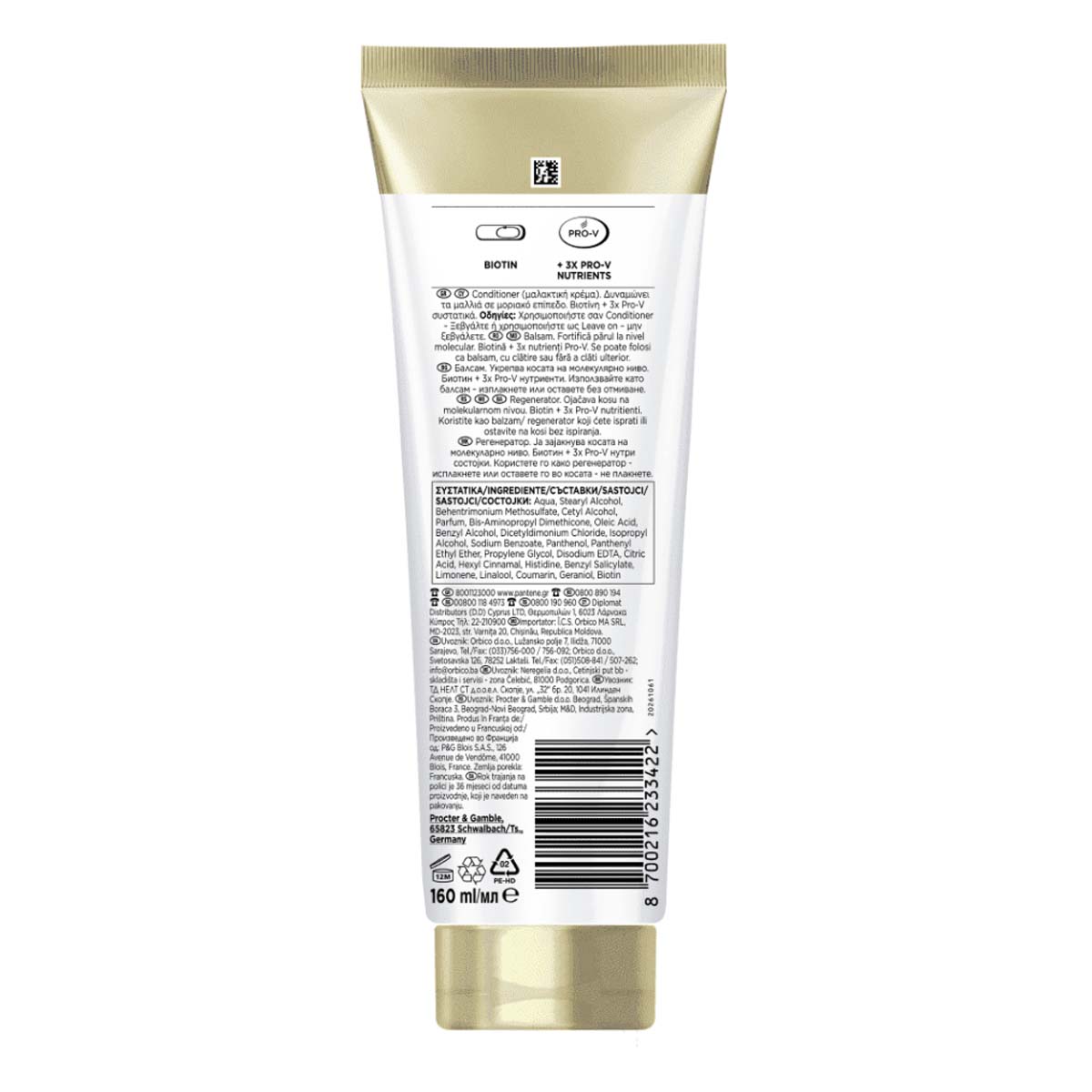 Aqua, Stearyl Alcohol, Behentrimonium Methosulfate, Cetyl Alcohol, Parfum, Bis-Aminopropyl Dimethicone, Oleic Acid, Benzyl Alcohol, Dicetydimonium Chloride, Isopropyl Alcohol, Sodium Benzoate, Panthenol, Panthenyl Ethyl Ether, Propylene Glycol, Disodium EDTA, Citric Acid, Hexyl Cinnamal, Histidine, Benzyl Salicylate, Limonene, Linalool, Coumarin, Geraniol, Biotin.