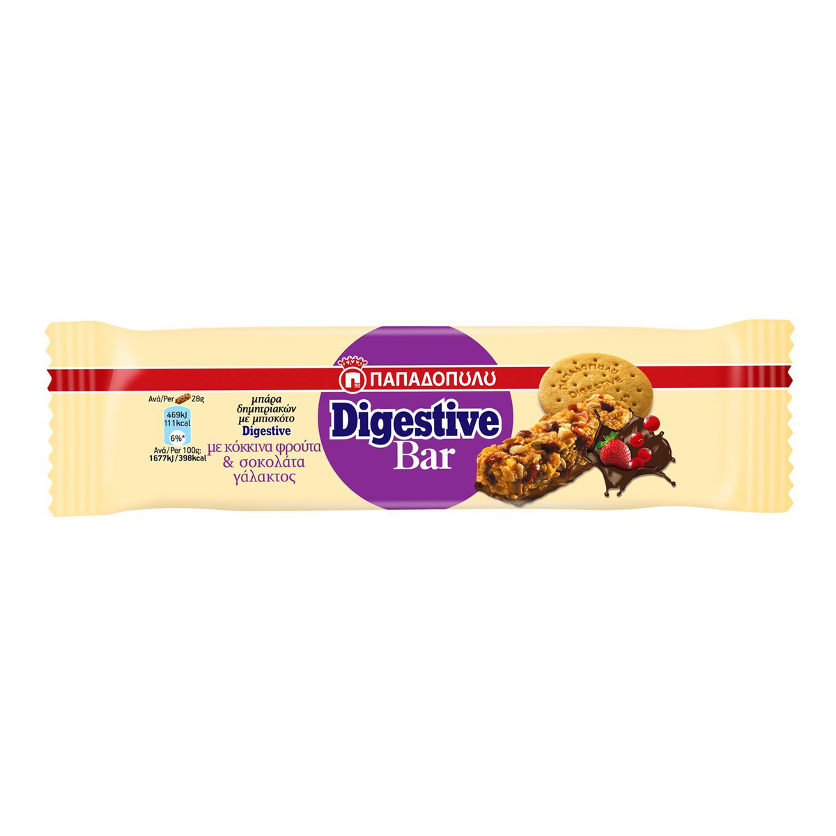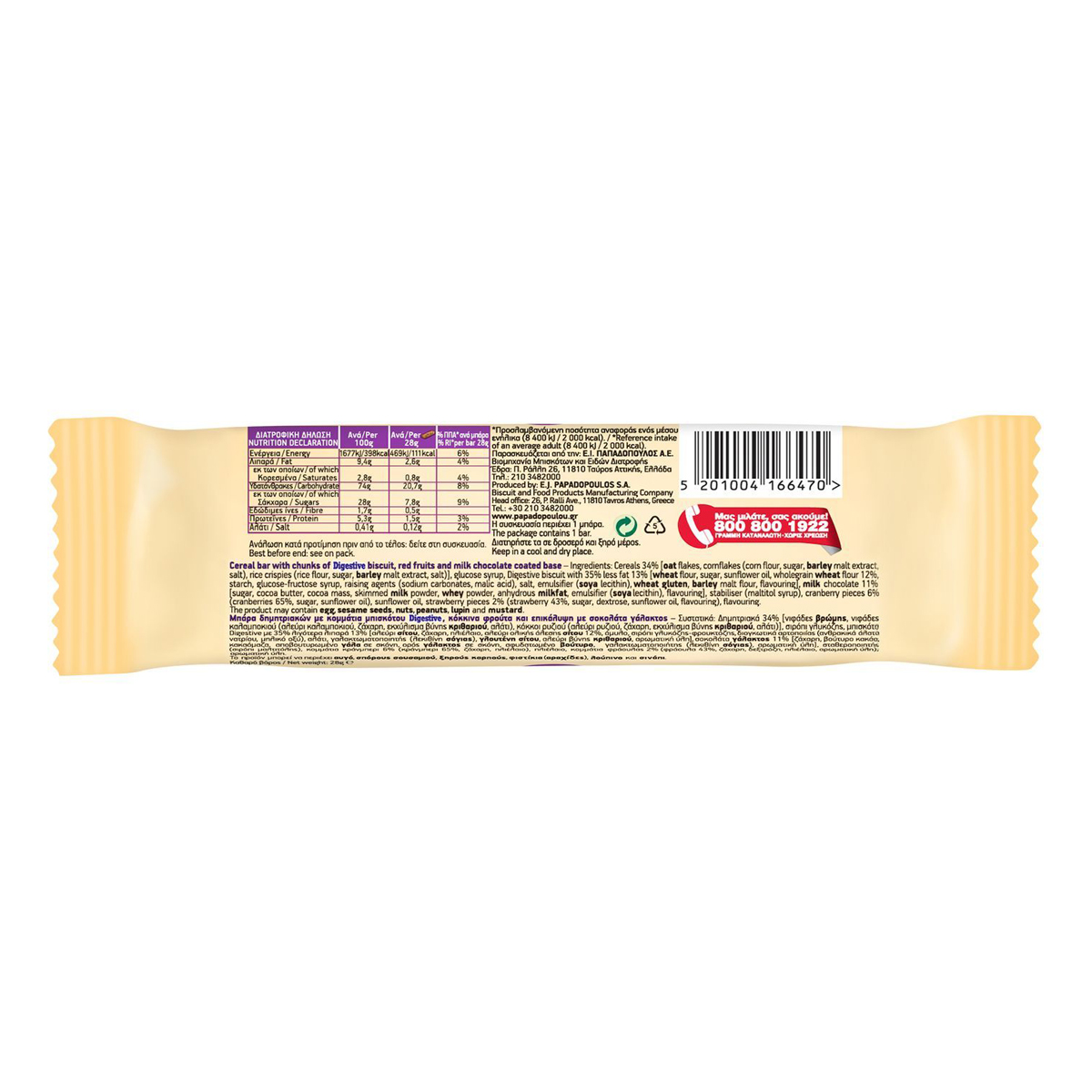 Λαχταριστά κόκκινα φρούτα σε τέλειο συνδυασμό με δημητριακά και μπισκότο Digestive με επικάλυψη σοκολάτας γάλακτος! Μπάρες δημητριακών για όσους αναζητούν την ακαταμάχητη γεύση της σοκολάτας σε συνδυασμό με δροσερά κόκκινα φρούτα!