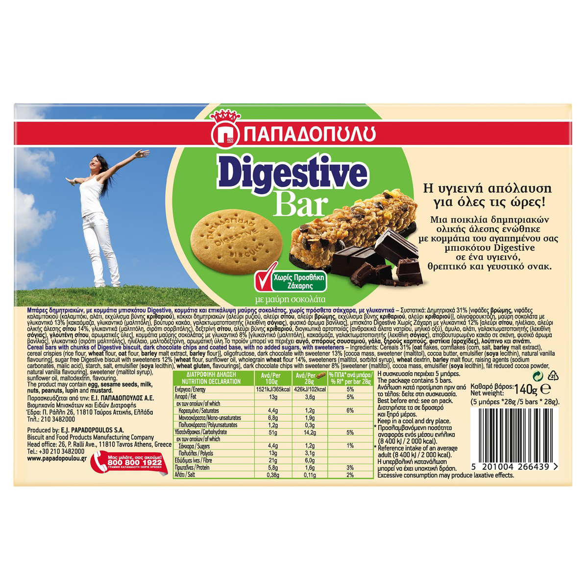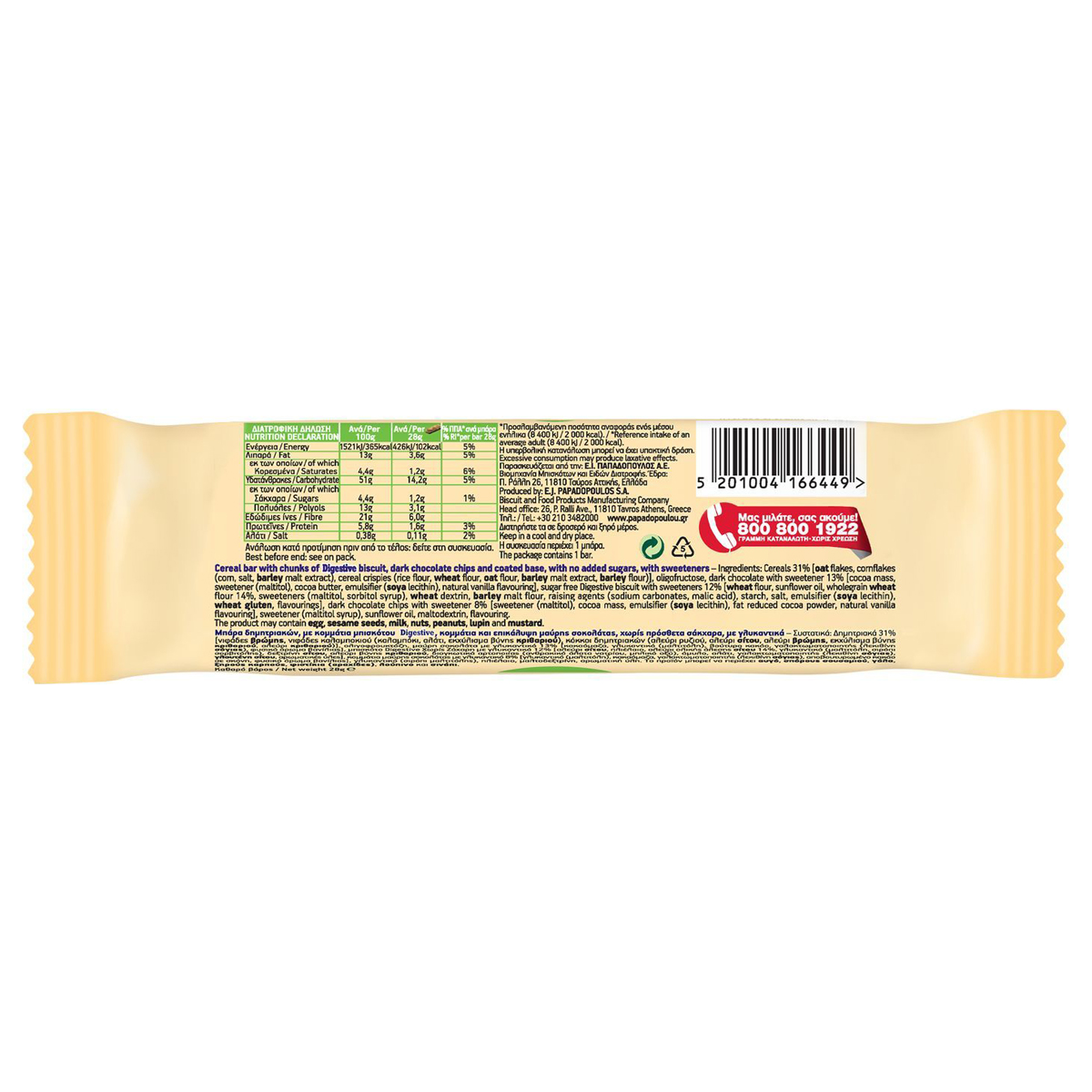 Μαύρη σοκολάτα σε μια μοναδική μπάρα δημητριακών Χωρίς Προσθήκη Ζάχαρης. Με θρεπτικά δημητριακά και κομμάτια του αγαπημένου σου μπισκότου Digestive Χωρίς Ζάχαρη. Μια επανάσταση στις μπάρες δημητριακών!