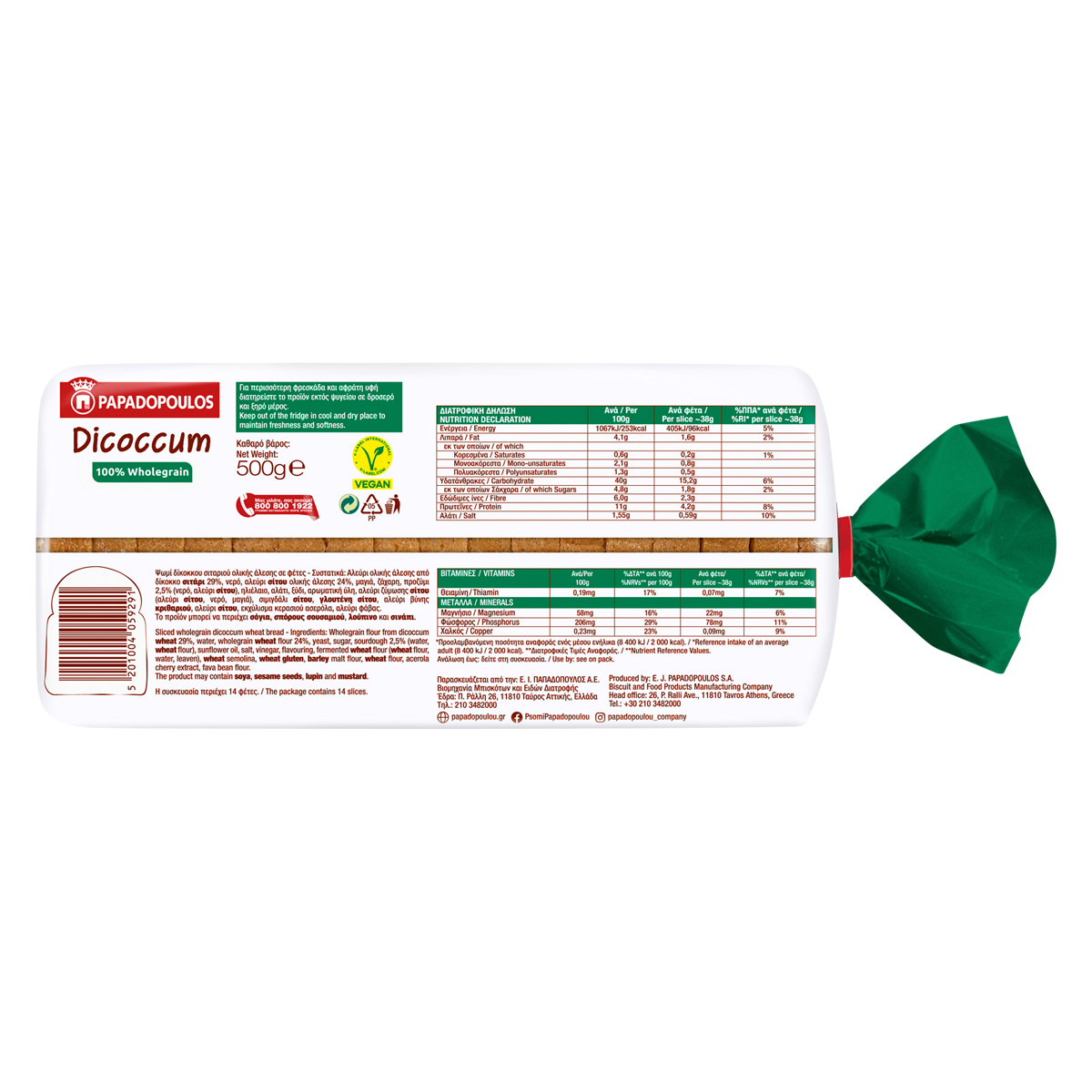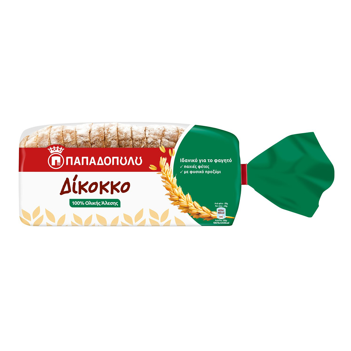 Το ψωμί ‘’Δίκοκκο Ολικής Άλεσης’’ με δίκοκκο σιτάρι ολικής άλεσης φέρνει τα οφέλη του Δίκοκου σιταριού στην καθημερινή μας διατροφή καθώς αποτελεί πηγή έδώδιμων ινών, βιταμινών όπως θειαμίνη καθώς και μετάλλων όπως ο φώσφορος, ο χαλκός και το μαγνήσιο. Πλούσιες απολαυστικές φέτες ολικής άλεσης, ιδανικές για open top sandwich και απολαυστικές μπρουσκέτες.