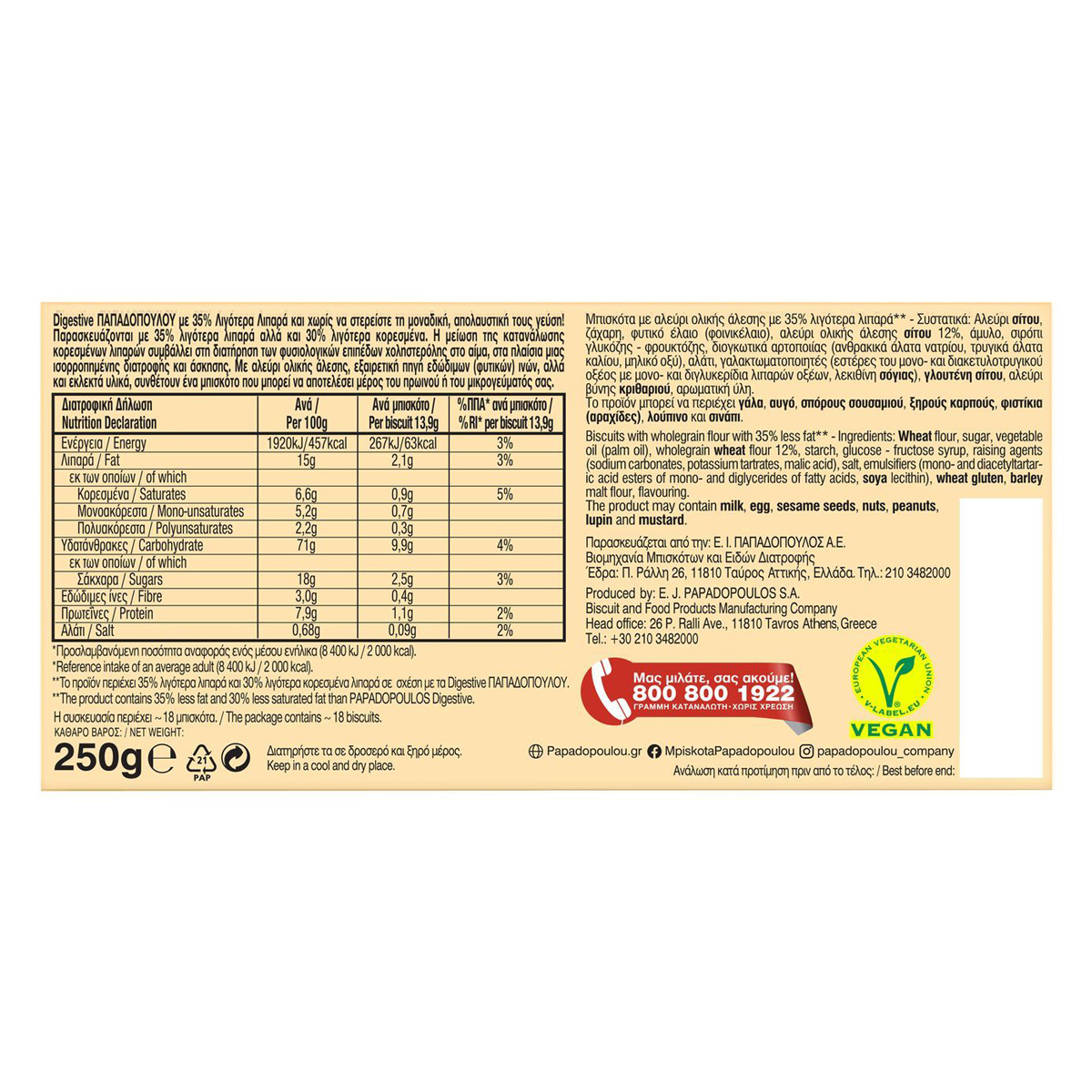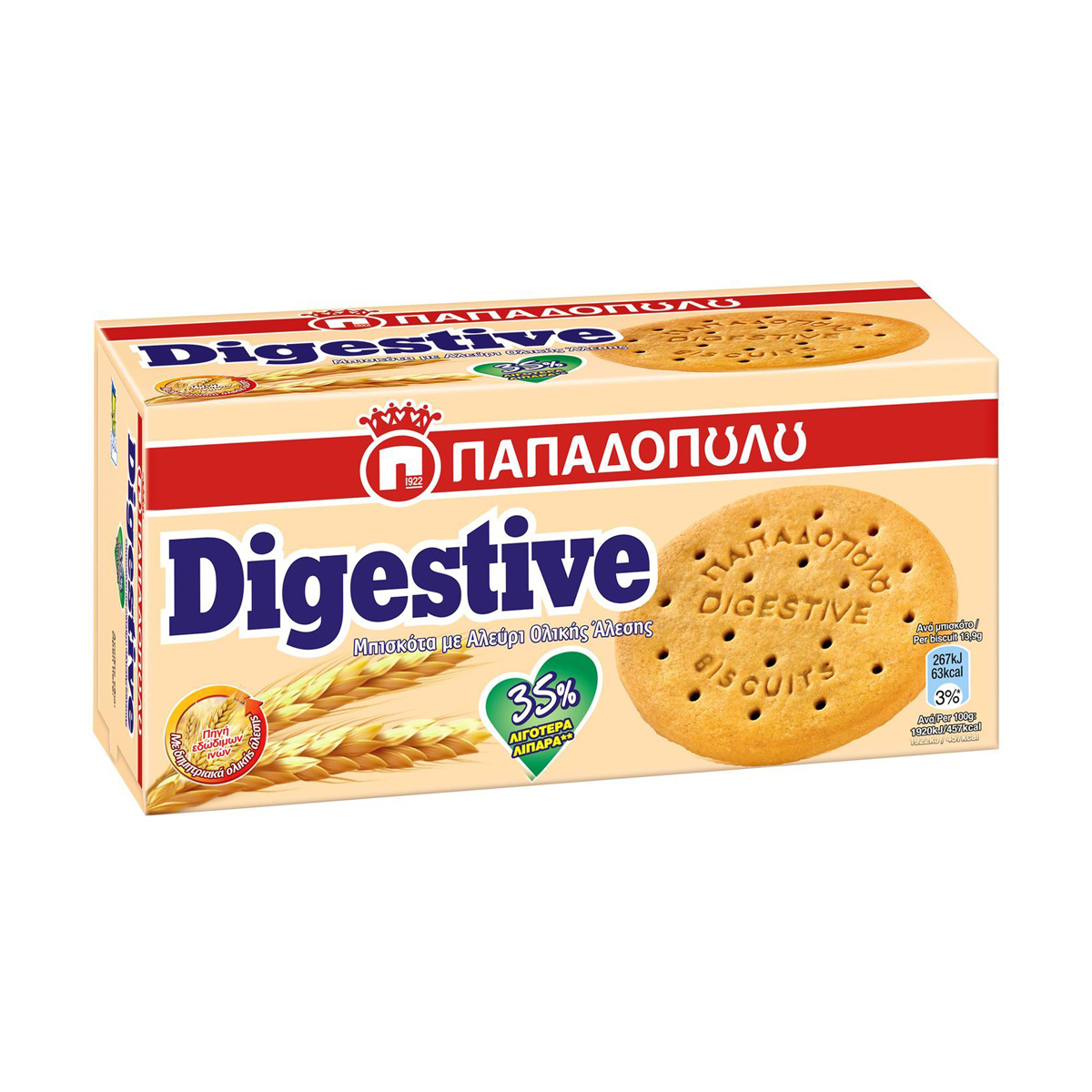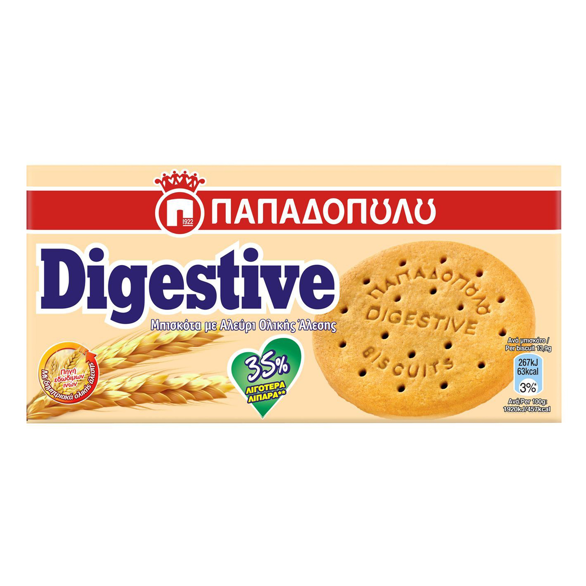 Digestive με 35% λιγότερα λιπαρά, για εσάς που θέλετε να περιορίσετε τα λιπαρά στη διατροφή σας. Παρασκευάζεται με δημητριακά ολικής άλεσης και αποτελεί πηγή φυτικών ινών.