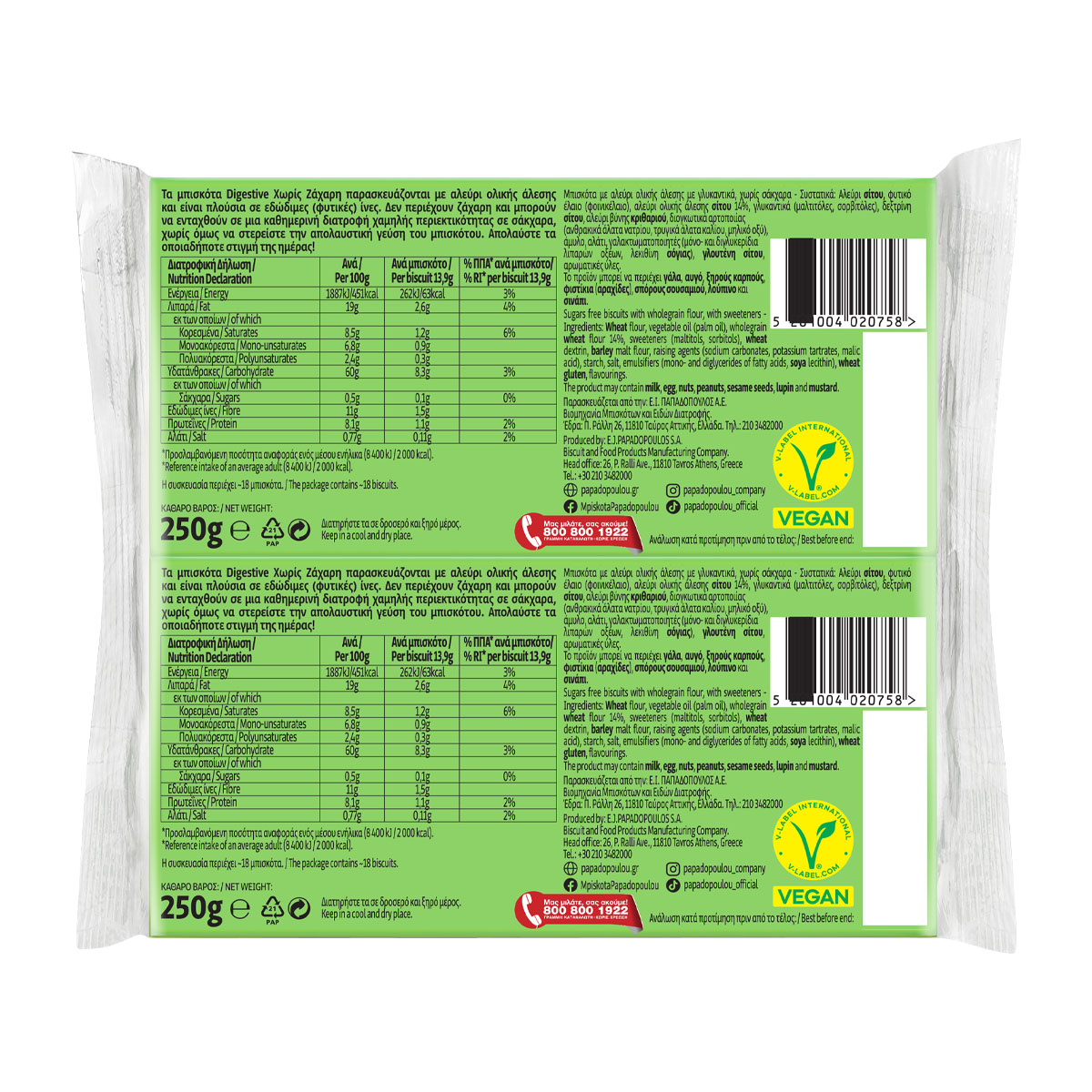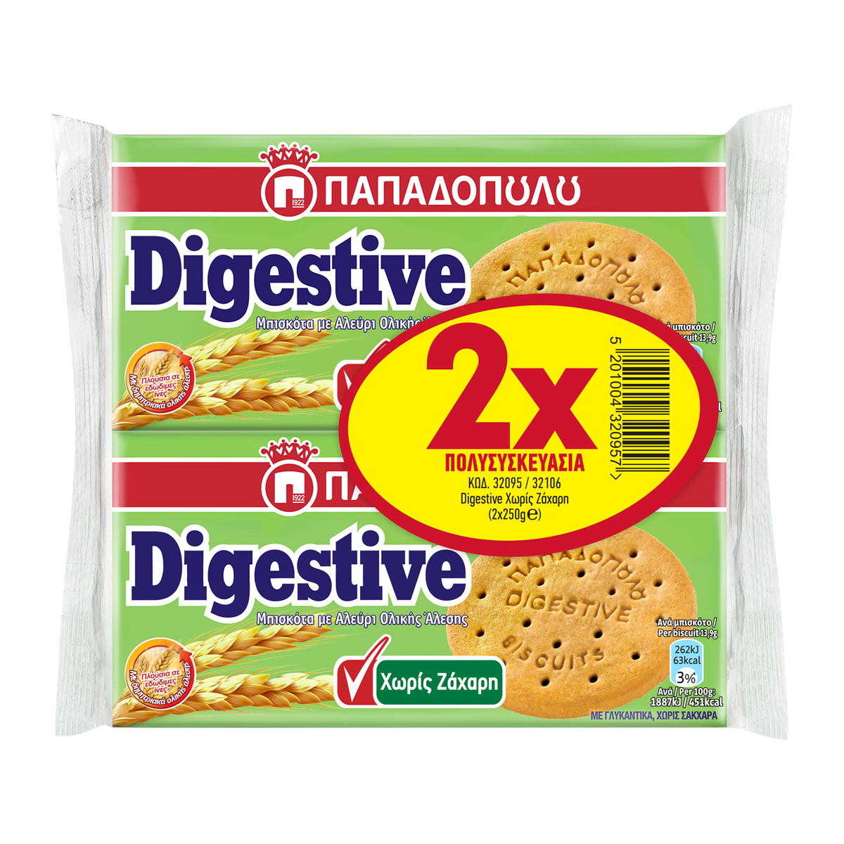 Digestive χωρίς ζάχαρη, για εσάς που αποφεύγετε τη ζάχαρη στη διατροφή σας. Είναι πλούσιο σε φυτικές ίνες και περιέχει δημητριακά ολικής άλεσης.