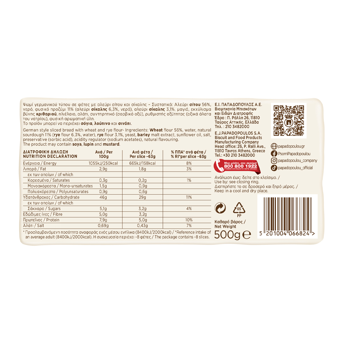 Το ψωμί Παπαδοπούλου Γερμανικού Τύπου αποτελεί ένα ξεχωριστό τύπο ψωμιού, ο οποίος χαρακτηρίζεται από την ιδιαίτερη υφή & γεύση του. Η μεστή, πλούσια γεύση του και η χαρακτηριστική υφή του αναδεικνύουν τη μοναδικότητα του.