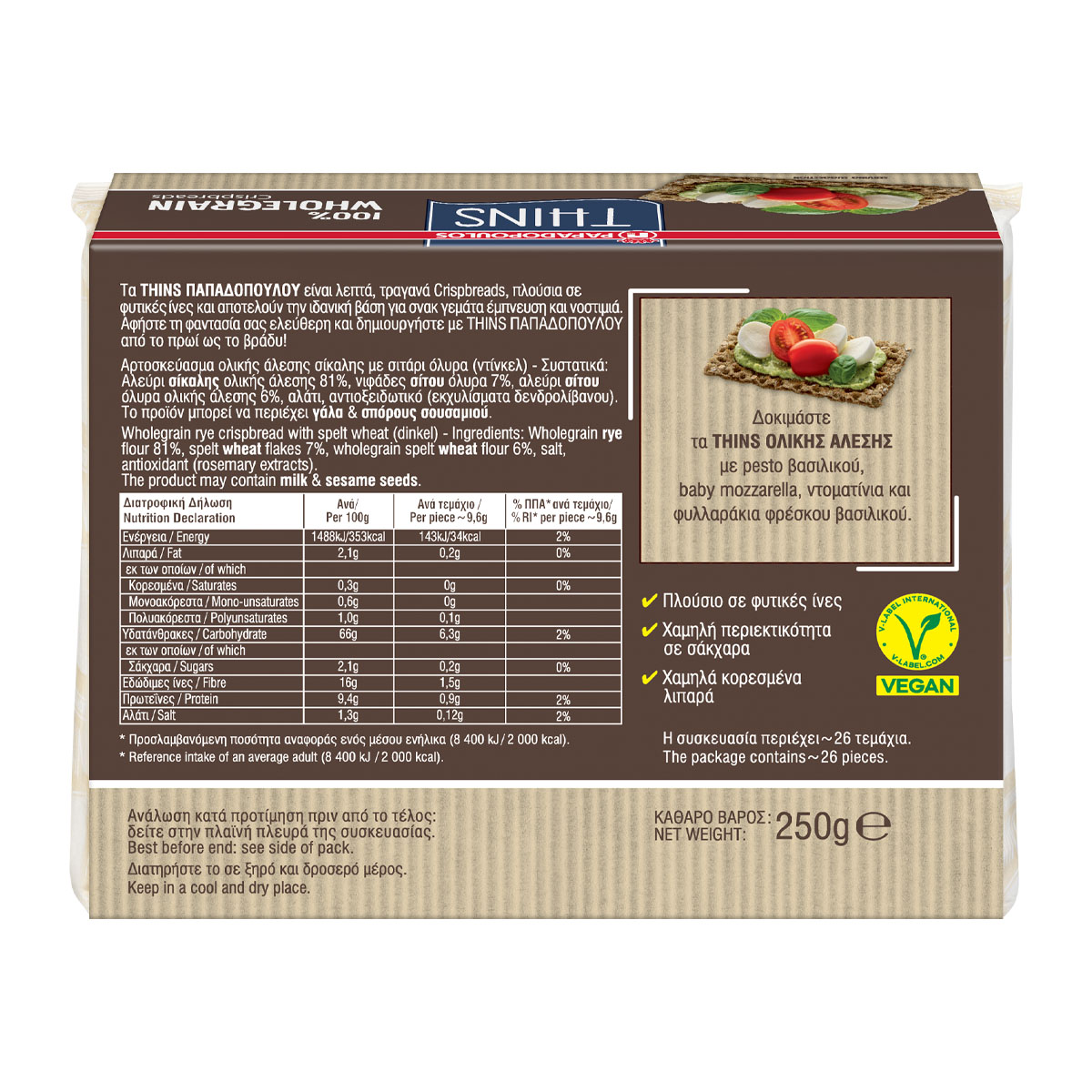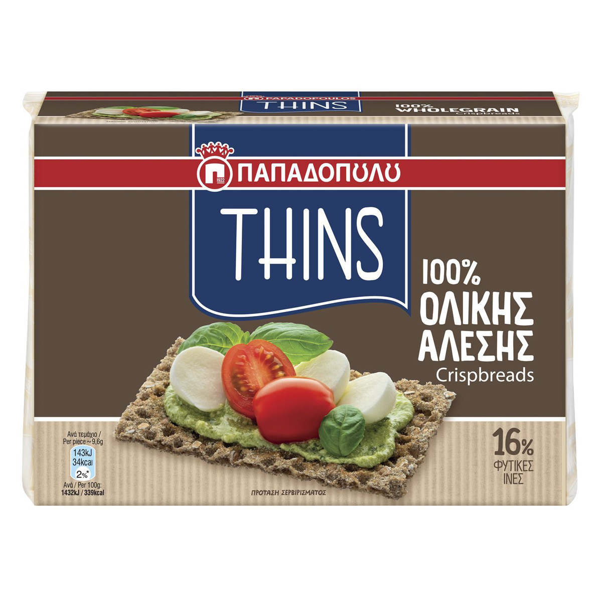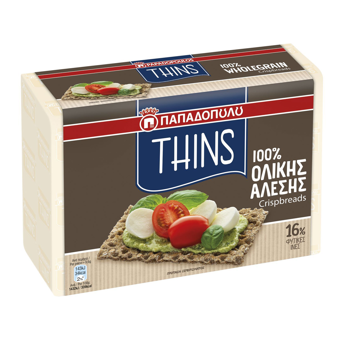 Τα ΤΗINS Ολικής άλεσης είναι λεπτά και τραγανά Crispbreads 100% oλικής άλεσής, που φτιάχνονται από αλεύρι σίκαλης ολικής άλεσης και επιπλέον περιέχουν αλεύρι και νιφάδες ντίνκελ (όλυρα), ένα εκλεκτό δημητριακό, που δίνει ιδιαίτερη γεύση και διατροφική αξία στο προϊόν. Τα THINS ολικής άλεσης έχουν 34 kcal ανά τεμάχιο.Ταιριάζουν το ίδιο υπέροχα τόσο με γλυκά όσο και με αλμυρά υλικά, δημιουργώντας υγιεινά και νόστιμα σνακ για όλες τις ώρες.