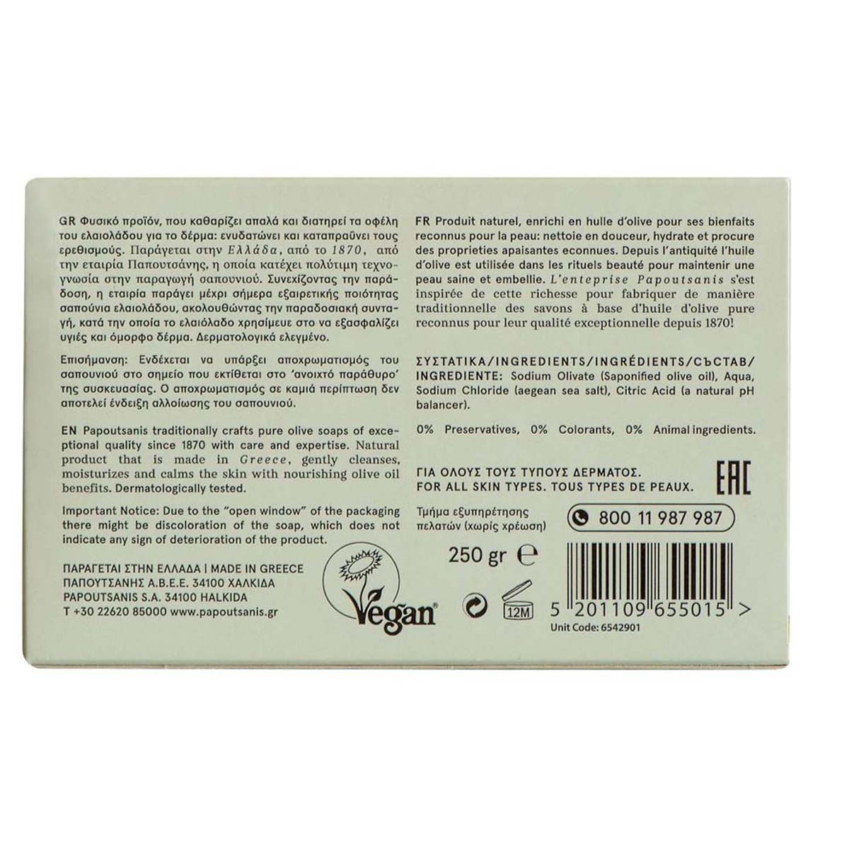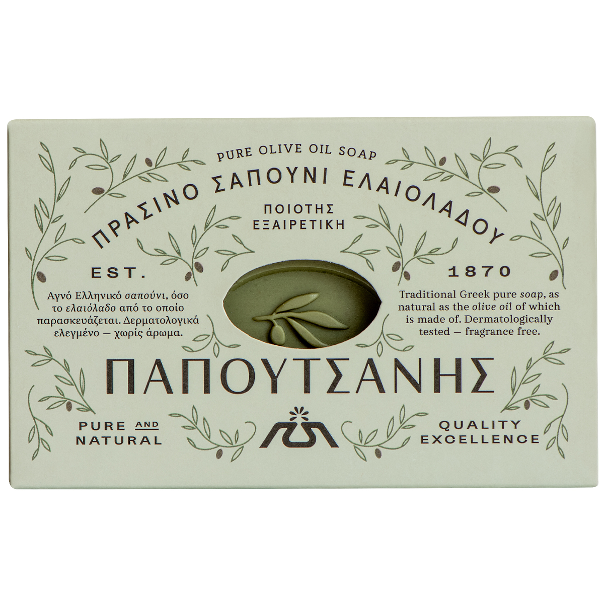 Στέρεο σαπούνι με εξαιρετική καθαριστική δράση, παρέχει ολοκληρωμένη υγιεινή για την επιδερμίδα. Αγνό όσο το ελαιόλαδο από το οποίο παρασκευάζεται, το παραδοσιακό πράσινο σαπούνι ΠΑΠΟΥΤΣΑΝΗΣ φροντίζει το πρόσωπο, τα μαλλιά και το σώμα, εδώ και 150 χρόνια. Δερματολογικά ελεγμένο