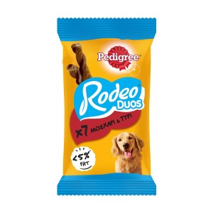 Οι σκύλοι λατρεύουν την εξερεύνηση. Τα σνακ Rodeo είναι γευστικά, στριφτά στικ, ιδανικά για καθημερινή χρήση. Το μοναδικό στριφτό σχήμα τούς προσδίδει μια απολαυστική υφή και τα καθιστά κατάλληλα για διασκεδαστικά παιχνίδια και στιγμές δεσμού. Το σνακ Rodeo έχει πρόσθετα ωμέγα 3, βιταμίνες και μεταλλικά στοιχεία, ενώ δεν περιέχει τεχνητές χρωστικές ή αρωματικές ουσίες.
