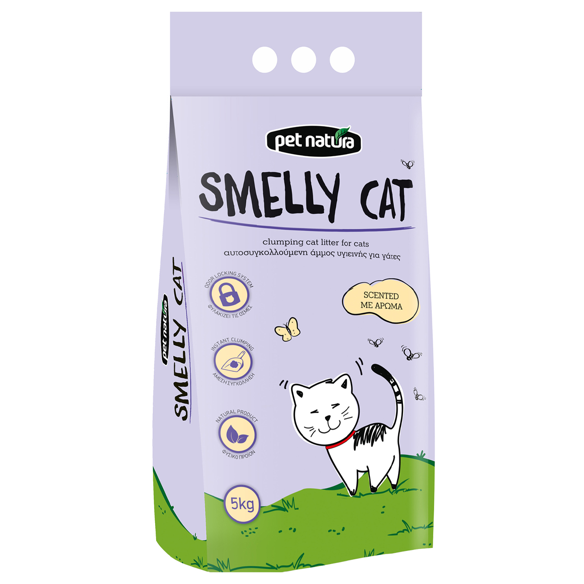Aυτοσυγκολλούμενη άμμος υγιεινής για γάτες. Η άμμος υγιεινής SMELLY CAT έχει υψηλή απορροφητικότητα και εξασφαλίζει υγιεινή και καθαριότητα στην λεκάνη της γάτας. Η SMELLY CAT είναι φυσικό προϊόν και καταπολεμά τα βακτήρια. Φυλακίζει τις Οσμές. Άμεση Συγκόλληση. Με άρωμα.
