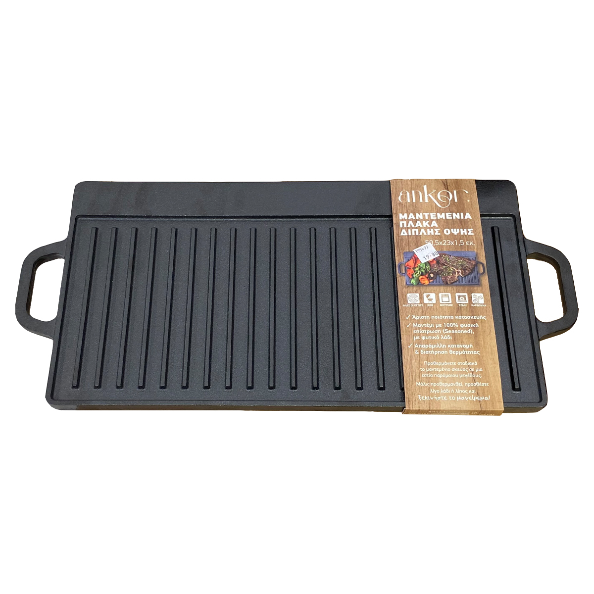 Μαντεμένια πλάκα από μαντέμι με 100% φυσική επίστρωση (seasoned) με φυτικό λάδι κ έτοιμη για χρήση. Κατάλληλη για χρήση σε όλες τις εστίες, τις ψησταριές μπάρμπεκιου κ τους φούρνους. Παρέχει εξαιρετική κατανομή κ διατήρηση της θερμότητας.