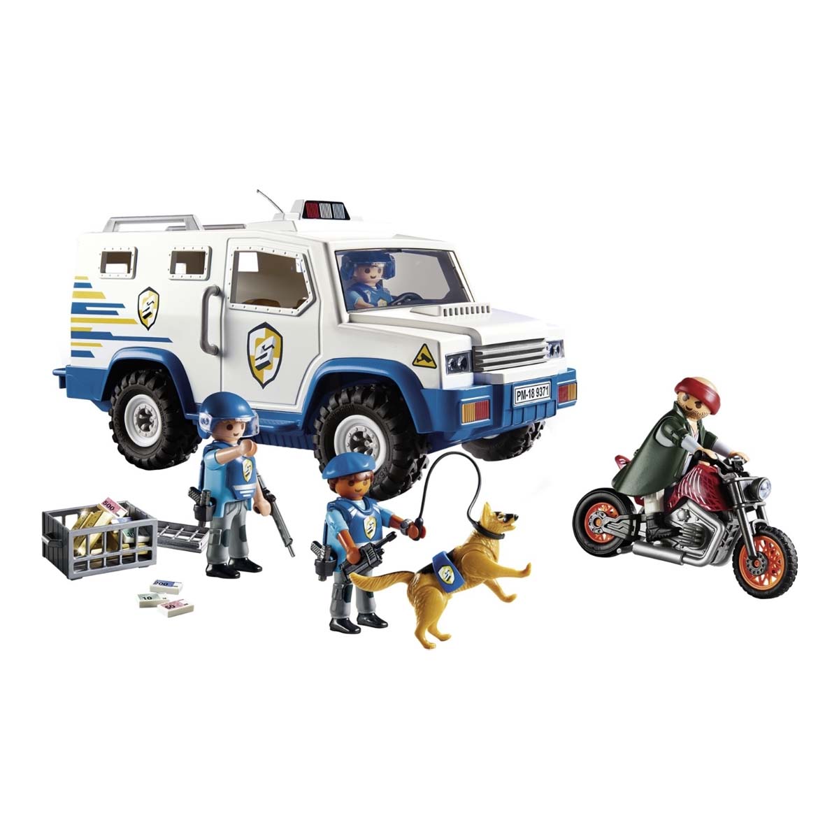 Ξεκινήστε μια περιπέτεια καταδίωξης κακοποιών με το φανταστικό PLAYMOBIL Όχημα χρηματαποστολής. Κατά τη διάρκεια της τολμηρής ληστείας του οχήματος, ένας απατεώνας επιχειρεί να αρπάξει τα χρήματα και να δραπετεύσει με τη γρήγορη μοτοσικλέτα του. Η μια φιγούρα μπορεί να μεταμορφωθεί σε κλέφτη περιστρέφοντας το κεφάλι του. Η οροφή του οχήμαυος είναι αποσπώμενη και οι πίσω πόρτες του ανοίγουν. Περιεχόμενα: τέσσερις φιγούρες PLAYMOBIL, σκυλί με λουρί, φορτηγό με χρήματα, μοτοσυκλέτα, κουτί με καπάκι, δύο τουφέκια, τέσσερα πιστόλια, τρείς θήκες για πιστόλια, χειροπέδες, έξι χαρτονομίσματα, τρείς ράβδοι χρυσού, δύο κράνη με προσωπίδες, ραδιόφωνο, μπερές, τρία προστατευτικά γιλέκα, κουβέρτα σκύλου, ρολόι χειρός.