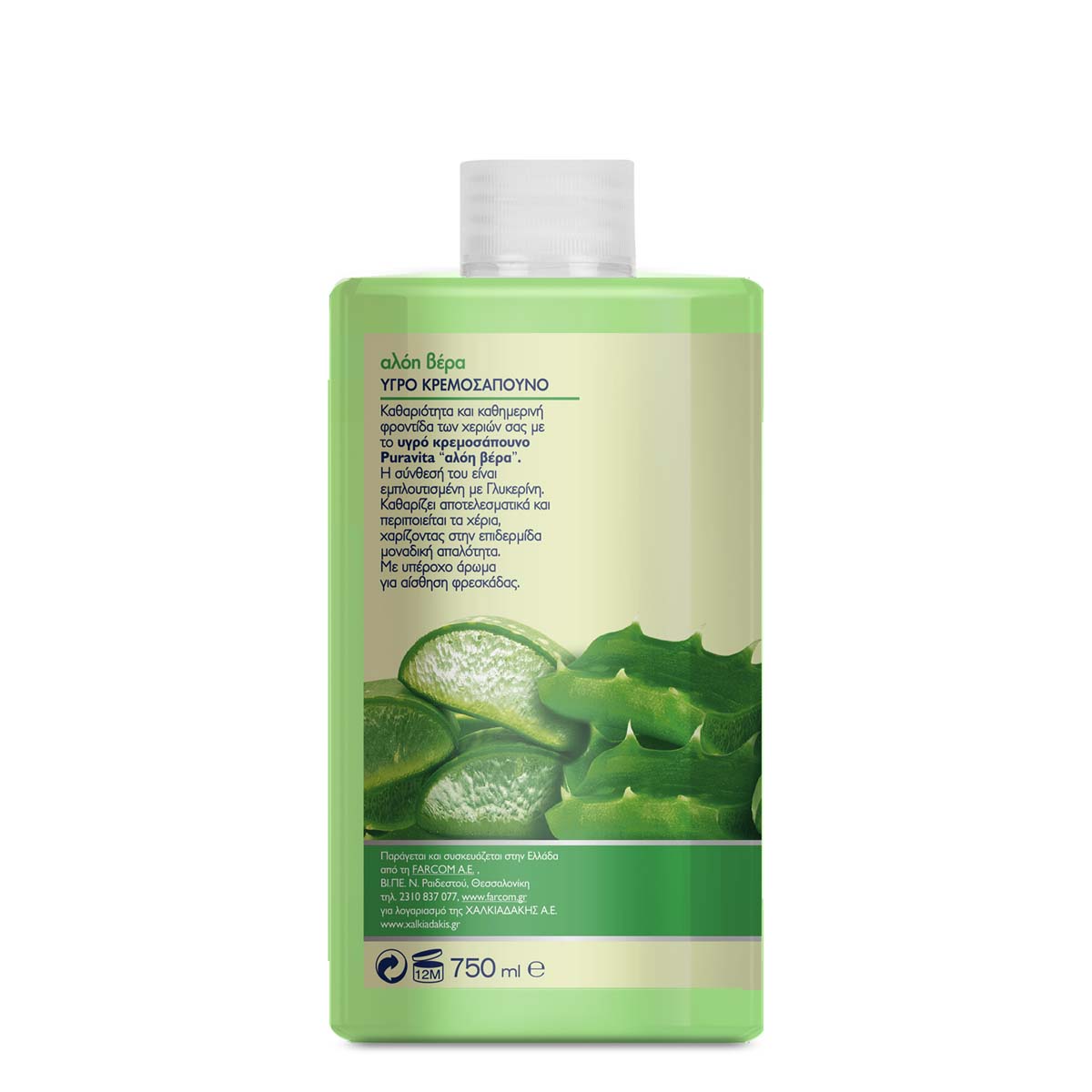 Καθαριότητα και καθημερινή φροντίδα των χεριών σας με το υγρό κρεμοσάπουνο Puravita “αλόη βέρα”. Η σύνθεσή του είναι εμπλουτισμένη με Γλυκερίνη. Καθαρίζει αποτελεσματικά και περιποιείται τα χέρια, χαρίζοντας στην επιδερμίδα μοναδική απαλότητα. Με υπέροχο άρωμα για αίσθηση φρεσκάδας.
