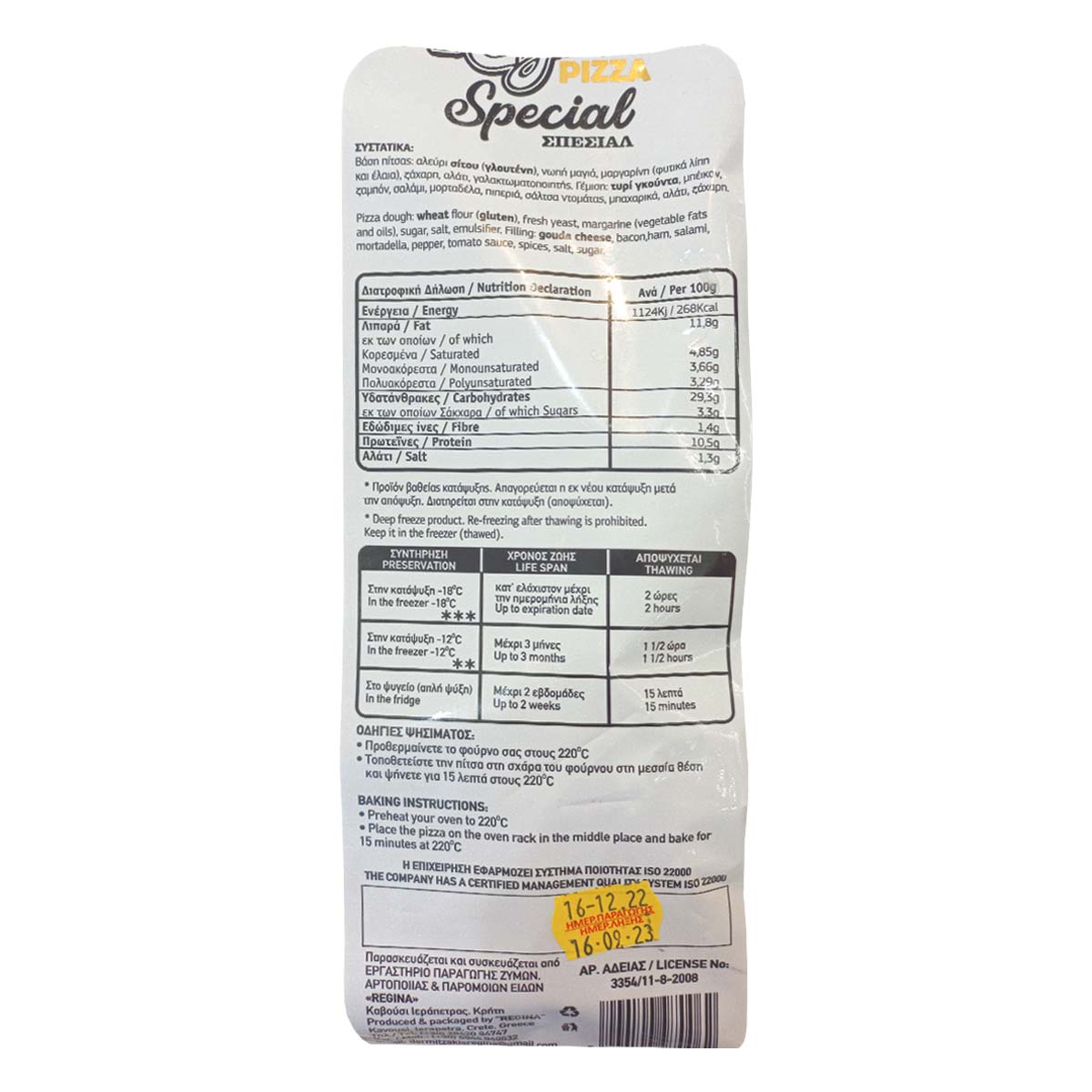 Βάση πίτσας, αλεύρι ΣΙΤΟΥ (ΓΛΟΥΤΕΝΗ), νωπή μαγιά, μαργαρίνη (φυτικά λίπη και έλαια), ζάχαρη, αλάτι, γαλακτωματοποιητής.