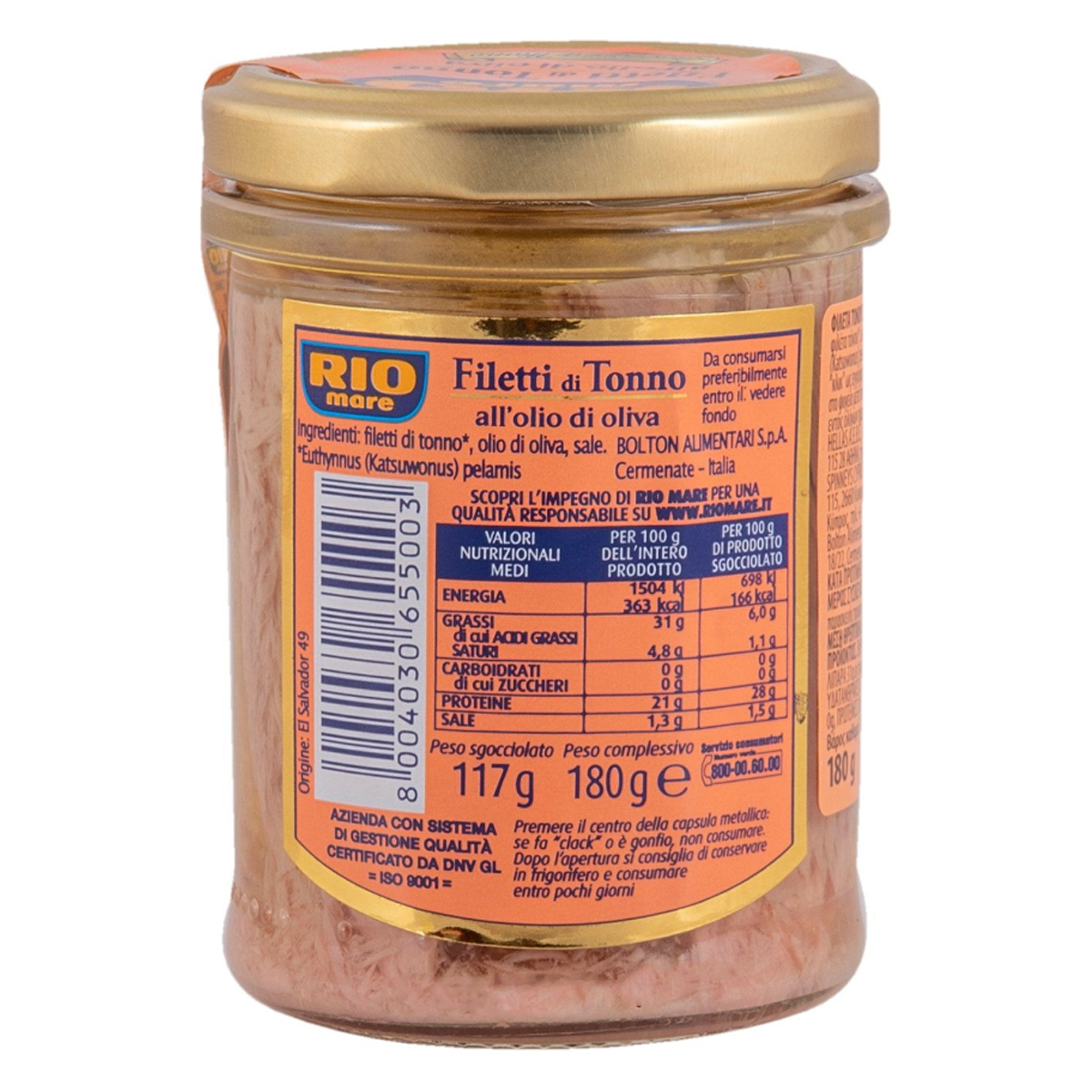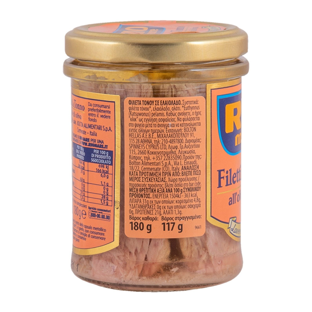 RIO mare Φιλέτα Τόνου σε Ελαιόλαδο σε Βαζάκι. Καθώς ανοίγετε το βαζάκι, ο ήχος "κλικ", λειτουργεί ως εγγύηση ασφαλείας. Τρυφερά, ολόκληρα Φιλέτα Τόνου, επιλεγμένα με προσοχή και καθαρισμένα στο χέρι. Να φυλάσσεται στο ψυγείο μετά το άνοιγμα & να καταναλώνεται εντός ολίγων ημερών.