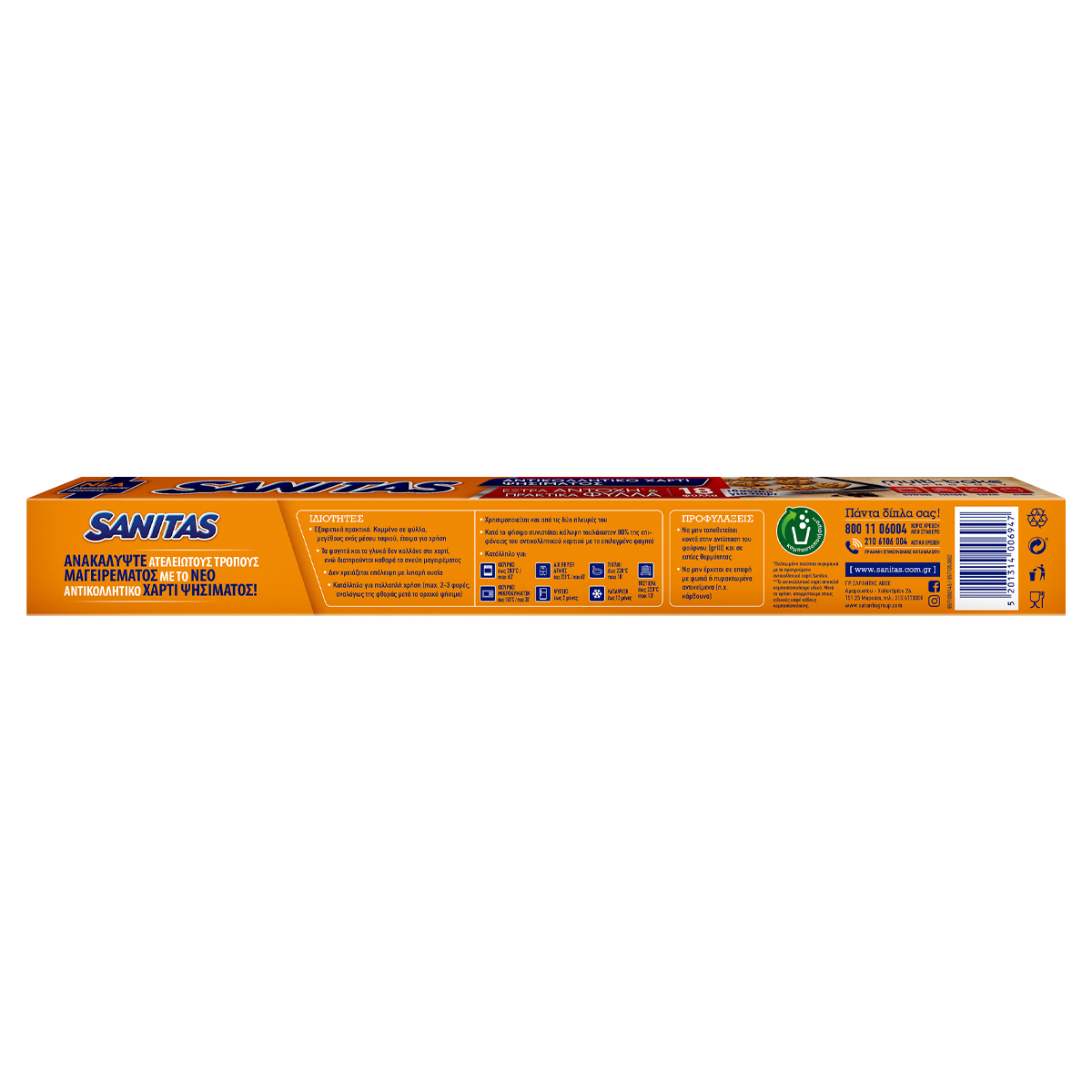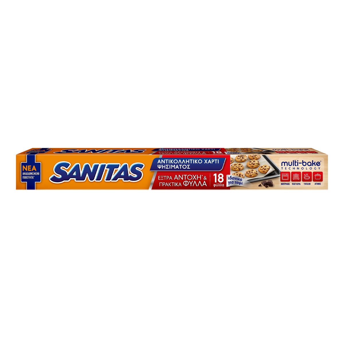 Το Νέο Αντικολλητικό Χαρτί Ψησίματος Sanitas έχει αναβαθμισμένη ποιότητα συγκριτικά με το προηγούμενο Αντικολλητικό χαρτί Sanitas και η μοναδική τεχνολογία multibake που διαθέτει του προσδίσει επιπλέον ιδιότητες για χρήση σε περισσότερα μαγειρικά σκεύη όπως στο τηγάνι και στον ατμό. Διατίθεται και κομμένο σε φύλλα ενός μέσου ταψιού έτοιμα για χρήση για να σας προσφέρει ακόμη περισσότερη ευκολία και πρακτικότητα στο μαγείρεμα. Προστατεύει τα φαγητά και τα γλυκά σας, καθώς χάρη στην ενισχυμένη αντικολλητική του ιδιότητα δεν κολλάνε στο χαρτί κατά το ψήσιμο. Σας βοηθά να μαγειρέψετε νόστιμα και υγιεινά χωρίς να χρειάζεται επάλειψη με λάδι ή βούτυρο, ενώ παράλληλα διατηρεί τα σκεύη καθαρά. Είναι κατάλληλο για χρήση στα εξής μαγειρικά σκεύη: φούρνο, τοστιέρα, τηγάνι, air fryer, ατμό, ψυγείο, κατάψυξη και φούρνο μικροκυμάτων.