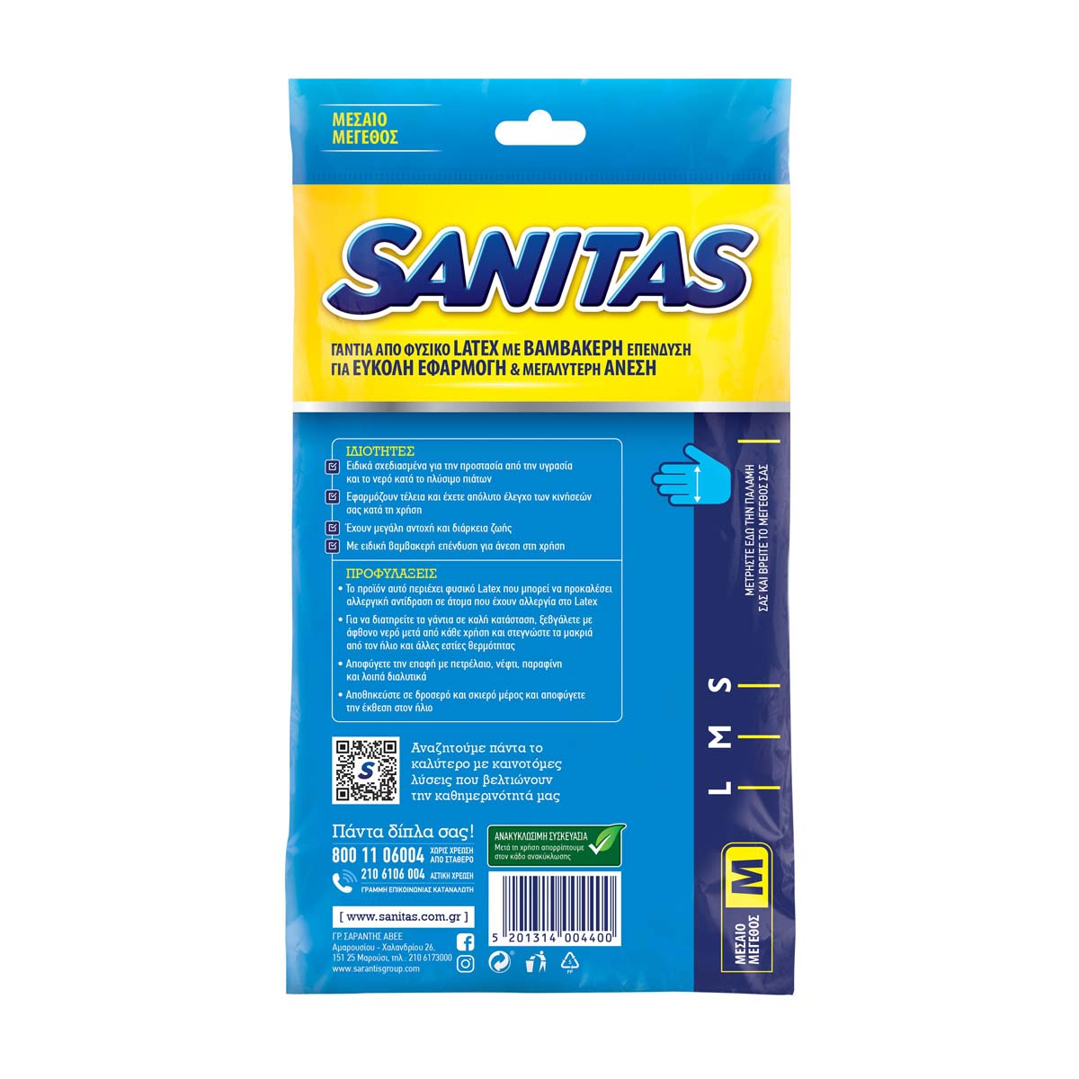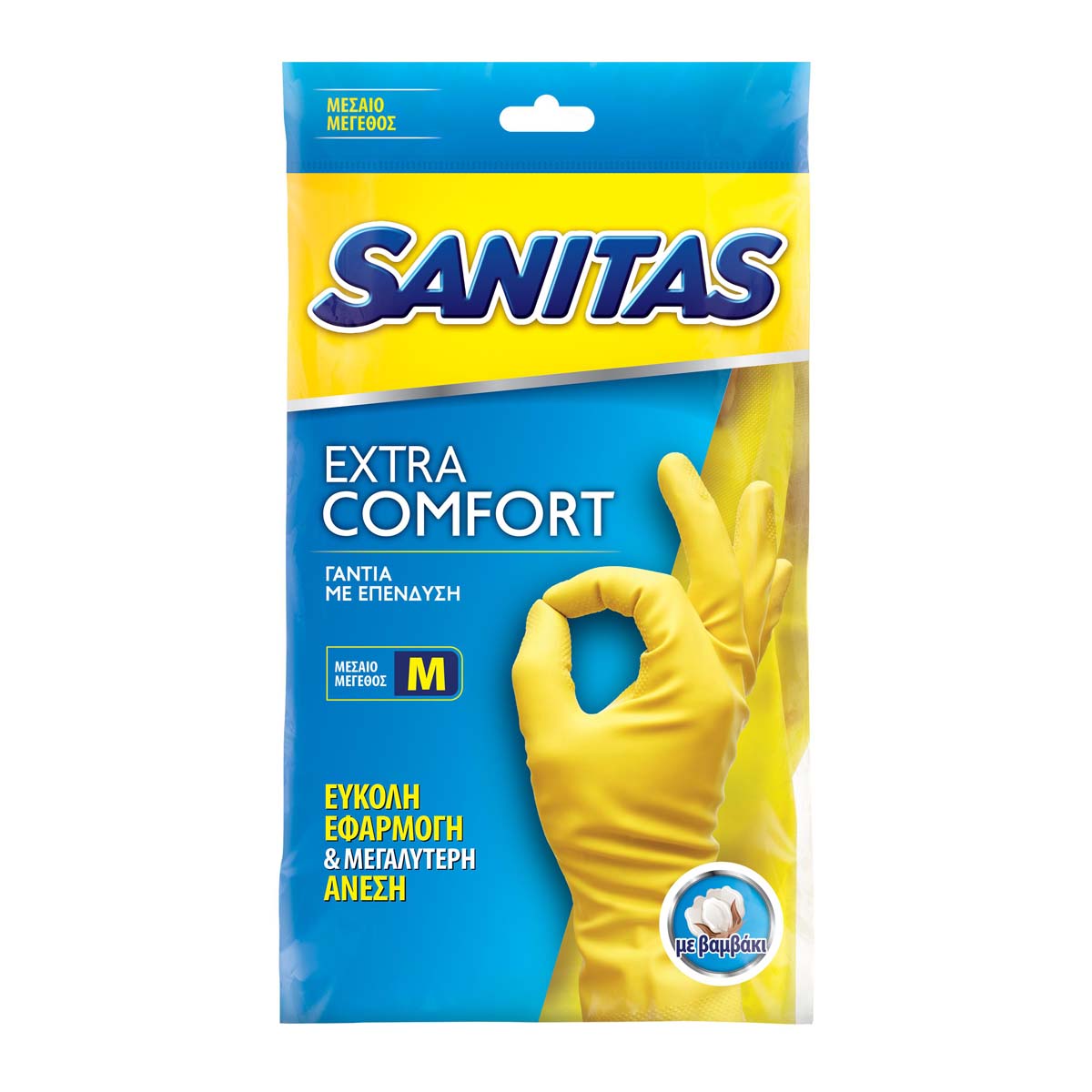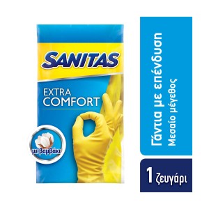 Τα λάτεξ γάντια Sanitas Extra Comfort είναι ειδικά σχεδιασμένα για την προστασία από την υγρασία και το νερό κατά το πλύσιμο πιάτων. Εφαρμόζουν τέλεια και χαρίζουν απόλυτο έλεγχο κινήσεων κατά τη χρήση. Διαθέτουν επένδυση με βαμβάκι για μεγαλύτερη άνεση. Μέγεθος Medium Εύκολη εφαρμογή Μεγάλη άνεση Από φυσικό Latex Με βαμβακερή επένδυση.