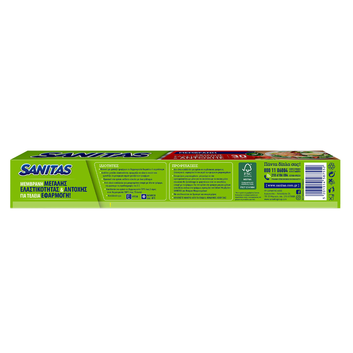 Η μεμβράνη Sanitas είναι υψηλής ελαστικότητας και αντοχής, ιδανική για συντήρηση των τροφίμων μέσα και έξω από το ψυγείο! Χάρη στη μεγάλη ελαστικότητά της εφαρμόζει εύκολα σε όλα τα σκεύη, εμποδίζοντας τη μεταφορά οσμών μεταξύ των τροφίμων. Είναι πολύ πρακτική στη χρήση, καθώς κόβεται εύκολα με ένα τράβηγμα για να τυλίξετε το σκεύος ή φαγητό που επιθυμείτε. -Υψηλής ελαστικότητας και αντοχής για τέλεια εφαρμογή -Πρακτική στη χρήση -Ιδανική για συντήρηση των τροφίμων μέσα και έξω από το ψυγείο -Κατάλληλη χρήση στην κατάψυξη σε θερμοκρασίες έως -30 °C -Εμποδίζει τη μεταφορά των οσμών μεταξύ των τροφίμων -Κατάλληλη για μακροχρόνια επαφή με όλα τα τρόφιμα.