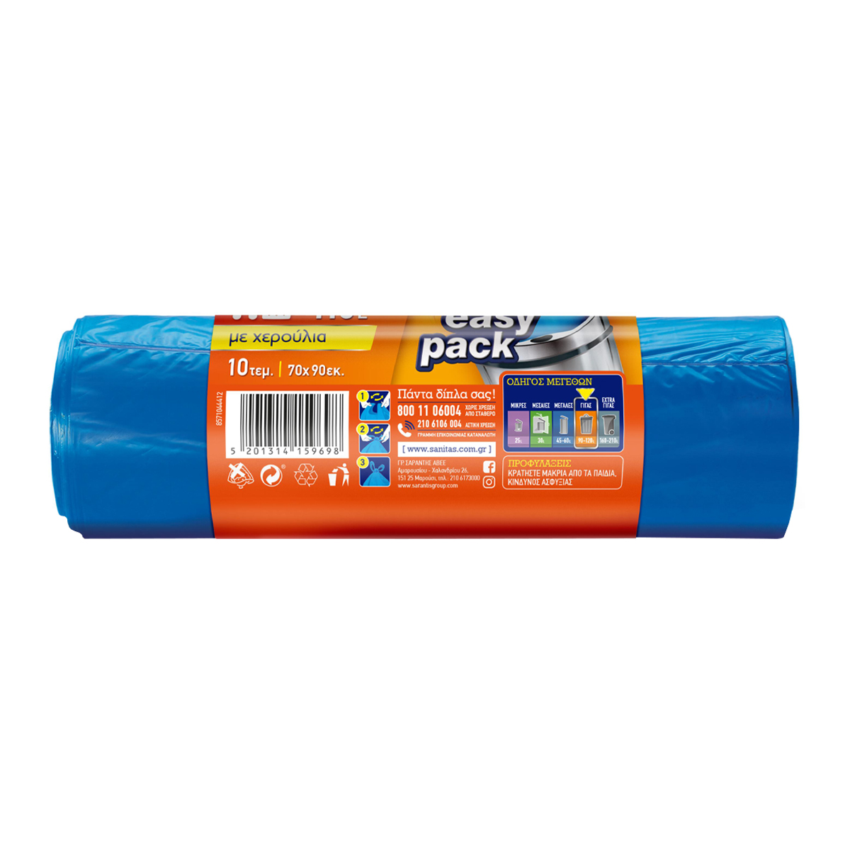 Οι σακούλες απορριμμάτων με χερούλια EASY PACK είναι ανθεκτικές χάρις στην ποιότητα του υλικού και την αστεροειδή ραφή στη βάση τους. Διαθέτουν πρακτικά χερούλια που διευκολύνουν το κλείσιμο και τη μεταφορά των απορριμμάτων σας.
