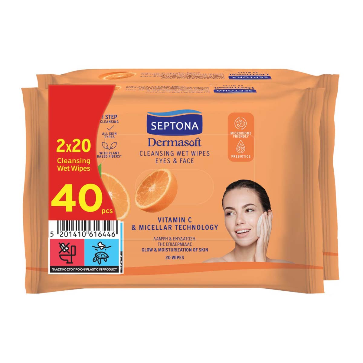 Septona Dermasoft Μαντηλάκια Ντεμακιγιάζ Με Vitamin C & Micellar 2 x 20 Τεμάχια