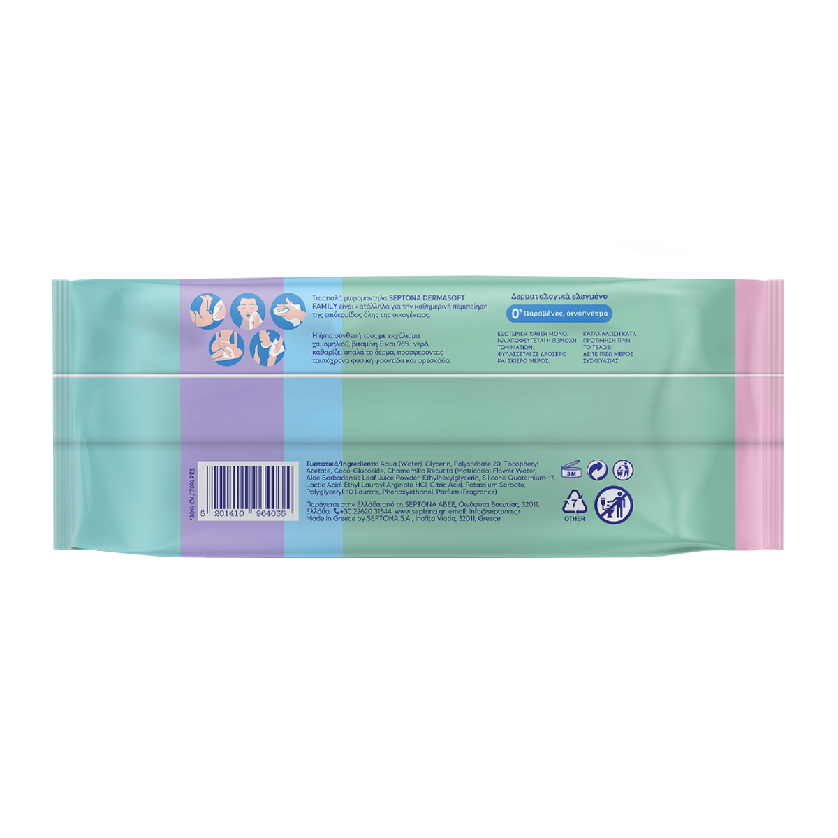 Τα απαλά μωρομάντιλα septona dermasoft είναι ιδανικά για την καθημερινή περιποίηση της επιδερμίδας όλης της οικογένειας. Η ιδιαίτερα ήπια σύνθεσή τους με εκχύλισμα χαμομηλιού, βιταμίνη Ε και 96% νερό, καθαρίζει απαλά το δέρμα, προσφέροντας ταυτόχρονα φυσική φροντίδα και φρεσκάδα.