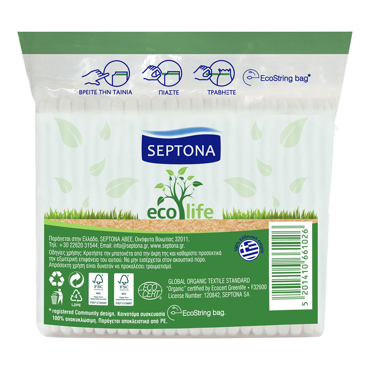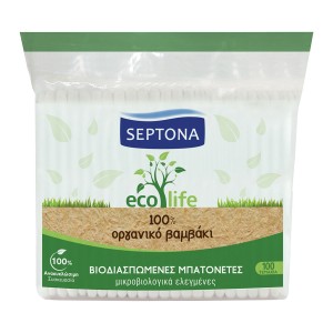 Οι χάρτινες μπατονέτες Ecolife, χάρη στις άκρες τους από 100% οργανικό βαμβάκι, καθαρίζουν απαλά και προσφέρουν φυσική φροντίδα σε όλη την οικογένεια. Χρησιμοποιώντας τις μπατονέτες SEPTONA ecolife μειώνετε το προσωπικό σας περιβαλλοντικό αποτύπωμα καθώς οι μπατονέτες είναι βιοδιασπώμενες και η συσκευασία 100% ανακυκλώσιμη. Η απόρριψη να γίνεται πάντα στους ειδικούς κάδους ανακύλωσης.
