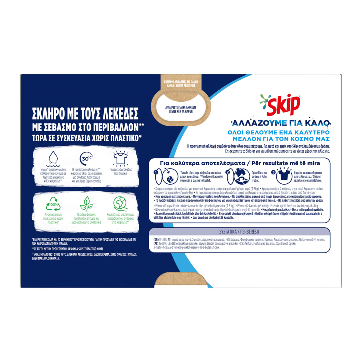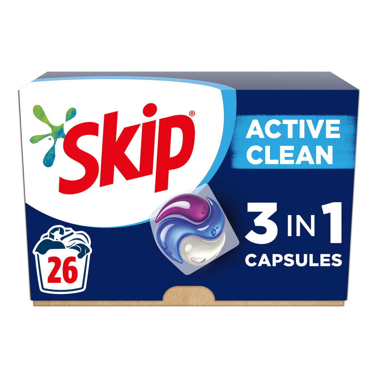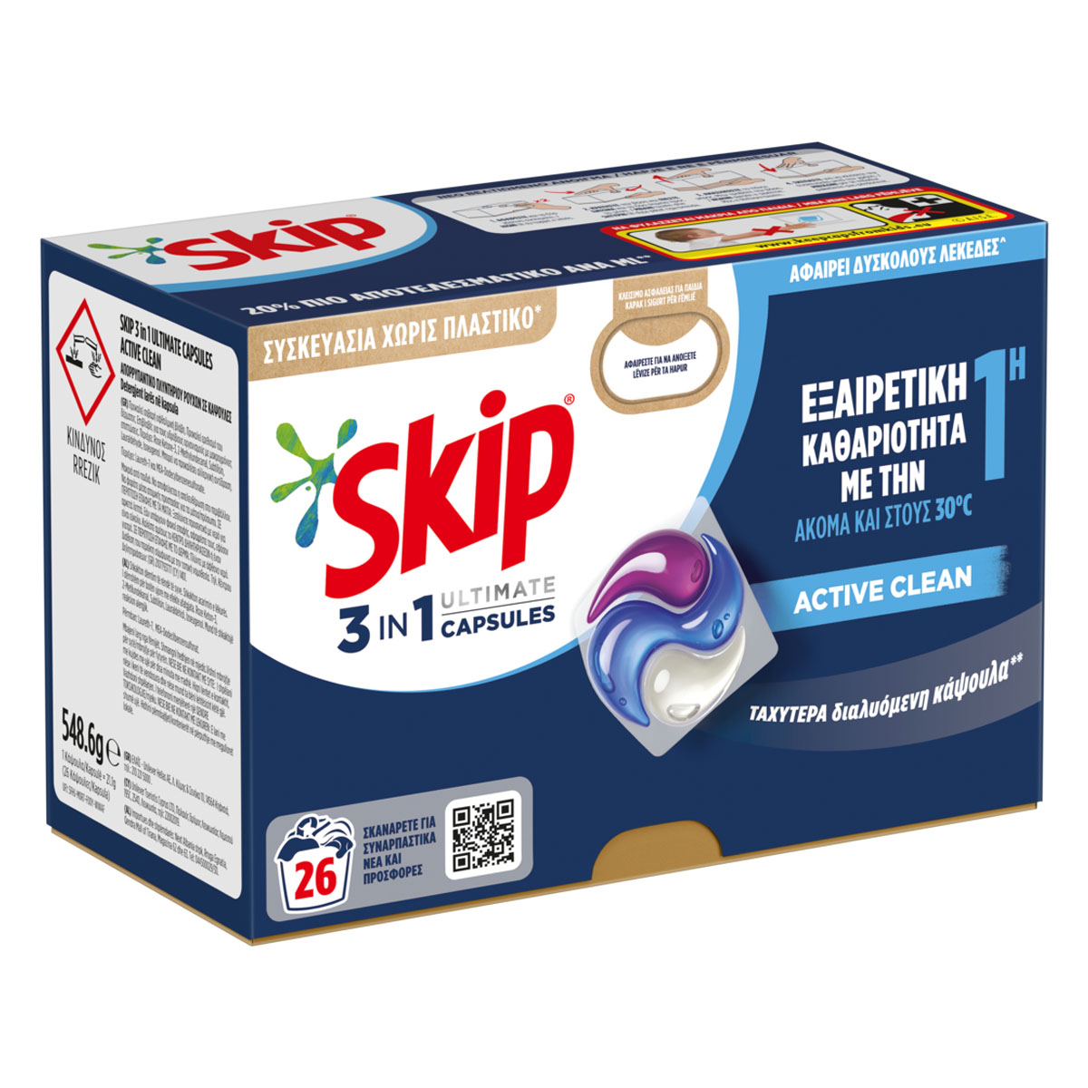 Οι κάψουλες Skip Ultimate Active Clean τριπλής δράσης, με νέα ισχυρή σύνθεση, αφαιρούν τους λεκέδες με την 1η, καταπολεμούν τους κόμπους που σχηματίζονται στα ρούχα και χαρίζουν υπέροχο άρωμα που διαρκεί! Επιπλέον, η προ-μετρημένη δόση της νέας κάψουλας Skip μειώνει τη σπατάλη απορρυπαντικού, συνδυάζοντας την αστραφτερή καθαριότητα με την οικονομία.