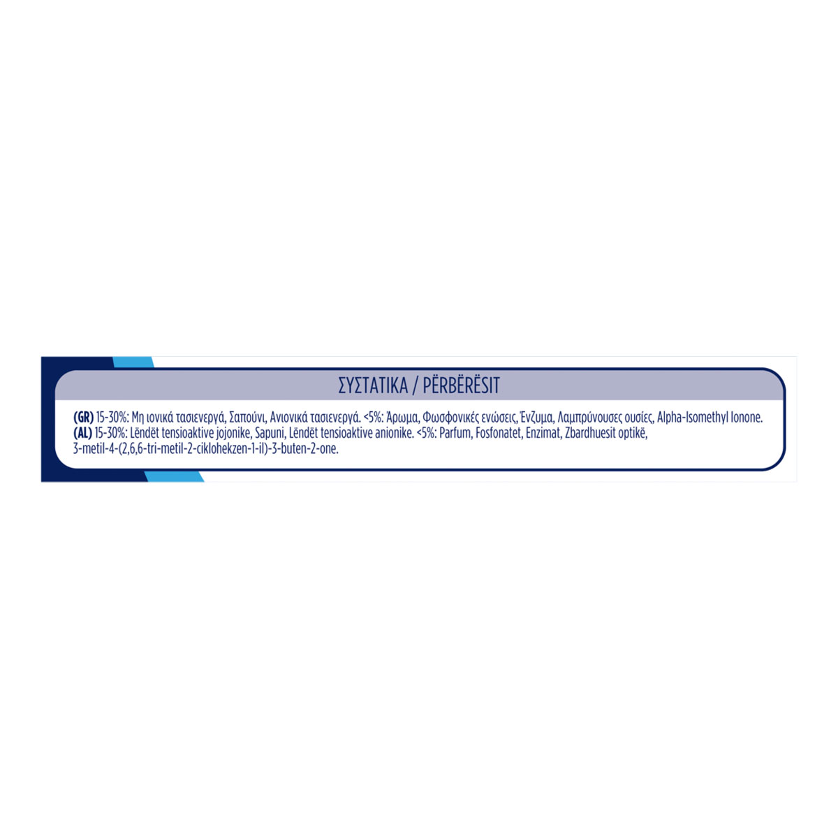 15-30%: Μη ιονικά τασιενεργά, Σαπούνι, Ανιονικά τασιενεργά, <5%: Άρωμα, Φωσφονικές ενώσεις, Ένζυμα, Λαμπρύνουσες ουσίες, Alpha-isomethyl ionone.