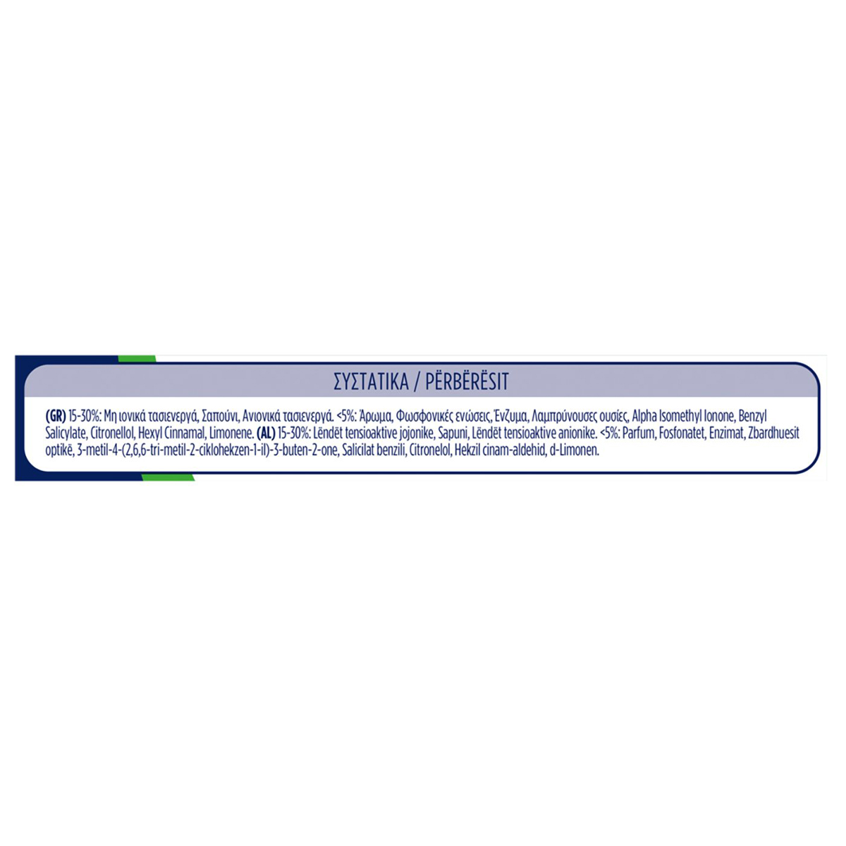 15-30%: Μη ιονικά τασιενεργά, Σαπούνι, Ανιονικά τασιενεργά. <5%: Άρωμα, Φωσφονικές ενώσεις, Ένζυμα, Λαμπρύνουσες ουσίες, Alpha Isomethyl Ionone, Benzyl Salicylate, Citronellol, Hexyl Cinnamal, Limonene.