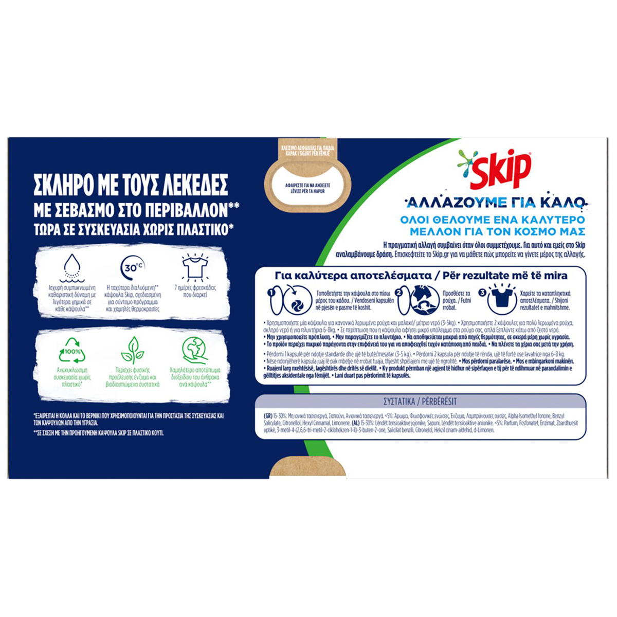 Οι κάψουλες Skip Ultimate Active Clean τριπλής δράσης, με νέα ισχυρή σύνθεση, αφαιρούν τους λεκέδες με την 1η, καταπολεμούν τους κόμπους που σχηματίζονται στα ρούχα και χαρίζουν υπέροχο άρωμα που διαρκεί. Επιπλέον, η προ-μετρημένη δόση της νέας κάψουλας Skip μειώνει τη σπατάλη απορρυπαντικού, συνδυάζοντας την αστραφτερή καθαριότητα με την οικονομία.