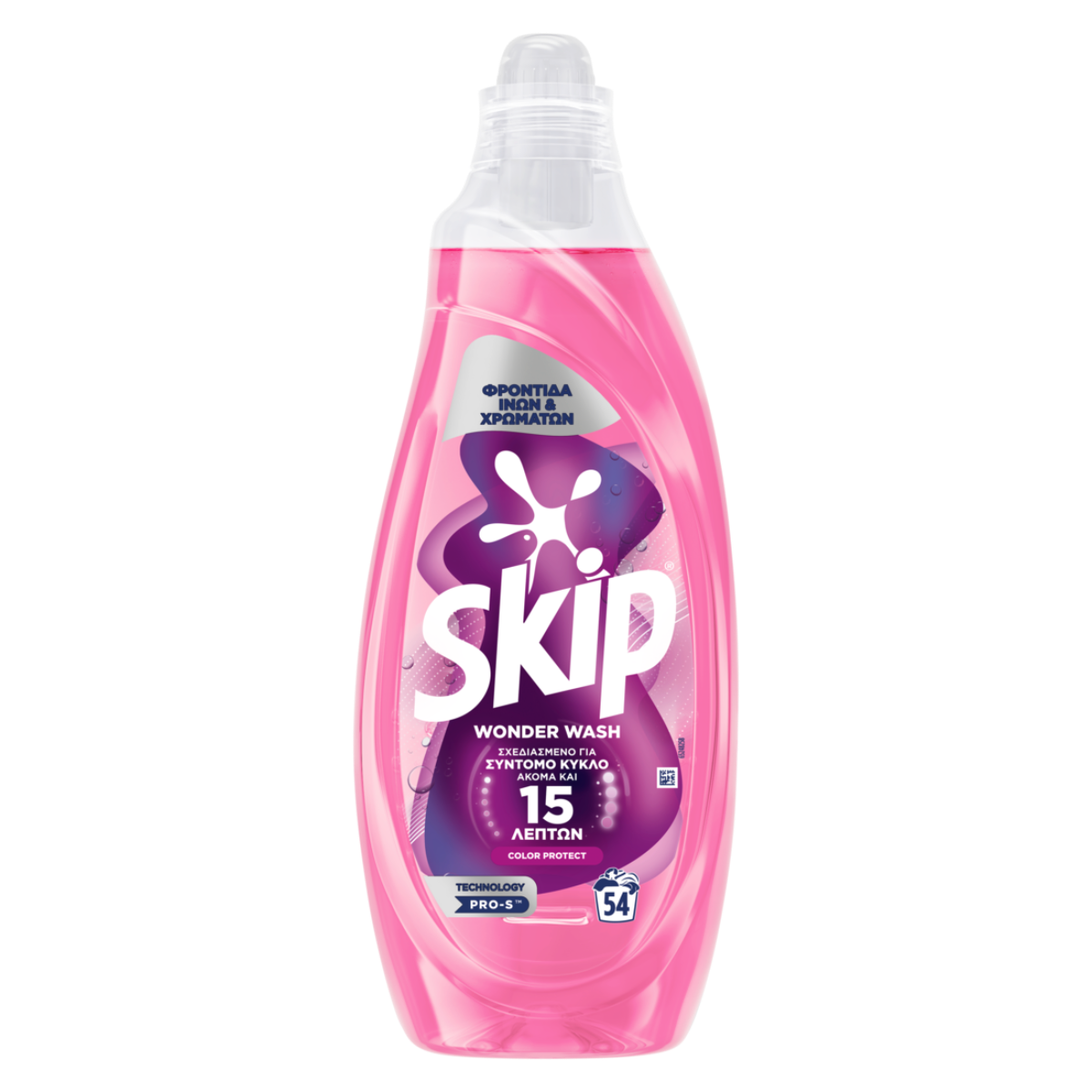 To Skip Color Protect φροντίζει τις ίνες των ρούχων και τα χρώματα.Η σειρά Wonder Wash είναι ειδικά σχεδιασμένη για σύντομο κύκλο ακόμα και 15 λεπτών.Σύνθεση γρήγορης δράσης με TECHNOLOGY PRO-S ™ και πρωτοποριακή σύνθεση ενζύμων που αφαιρεί τους κόμπους, προστατεύει και αναζωογονεί τα χρώματα.