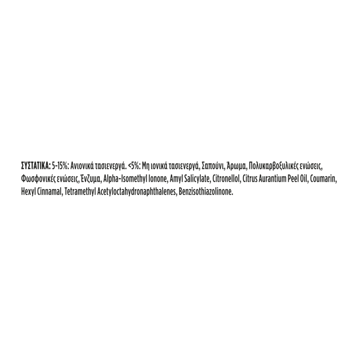 5-15%: Ανιονικά τασιενεργά.<5%: Μη ιονικά τασιενεργά, Σαπούνι, Άρωμα, Πολυκαρβοξυλικές ενώσεις, Φωσφονικές ενώσεις, Ένζυμα, Alpha-Isomethyl Ionone, Amyl Salicylate, Citronellol, Citrus Aurantium Peel Oil, Coumarin, Hexyl Cinnamal, Tetramethyl Acetyloctahydronaphthalenes, Benzisothiazolinone.