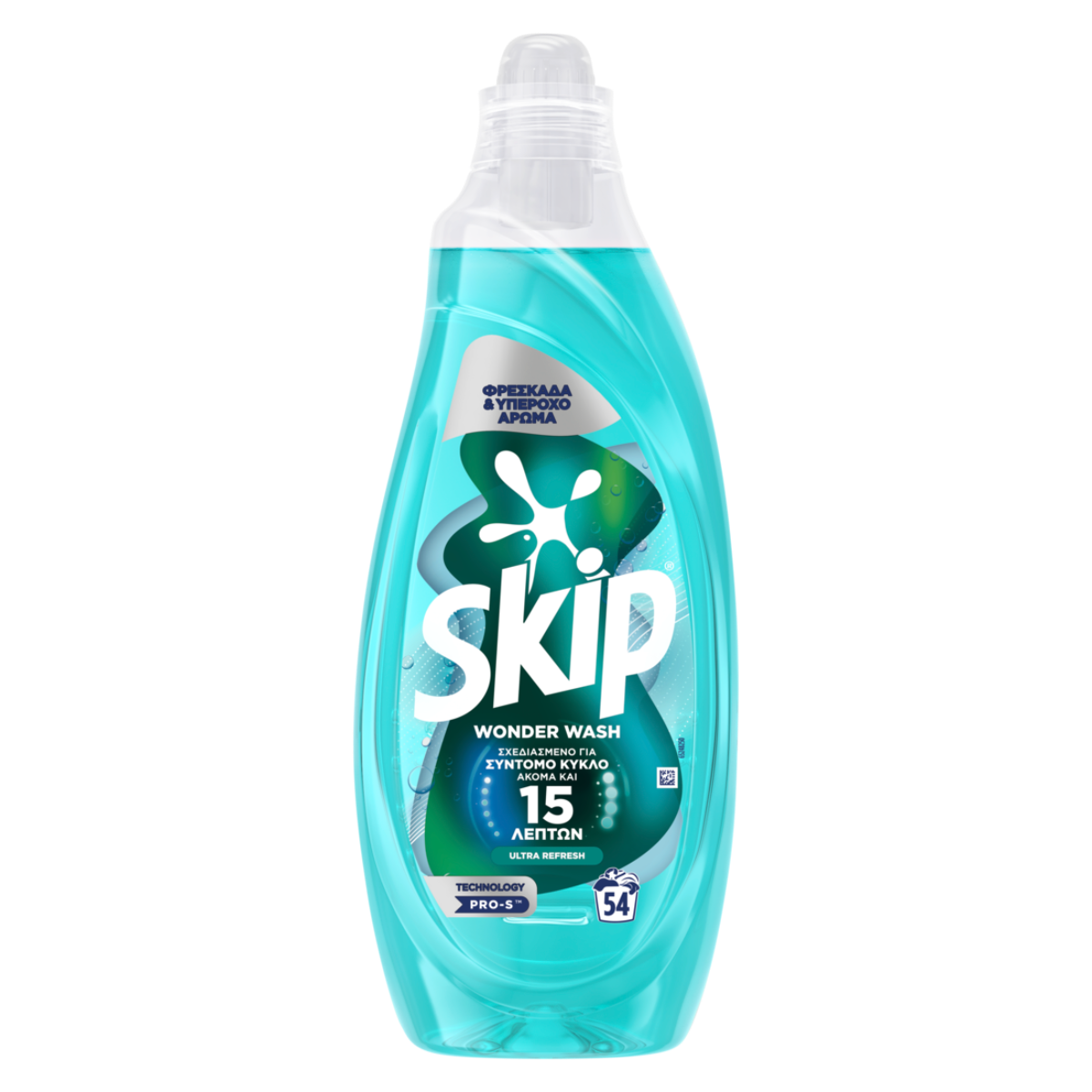 To Skip Ultra Refresh χαρίζει φρεσκάδα και υπέροχο άρωμα στα ρούχα σας.Η σειρά Wonder Wash είναι ειδικά σχεδιασμένη για σύντομο κύκλο ακόμα και 15 λεπτών.Σύνθεση γρήγορης δράσης με TECHNOLOGY PRO-S ™, προσφέρει εξαιρετική καθαριότητα με εκπληκτικό άρωμα.
