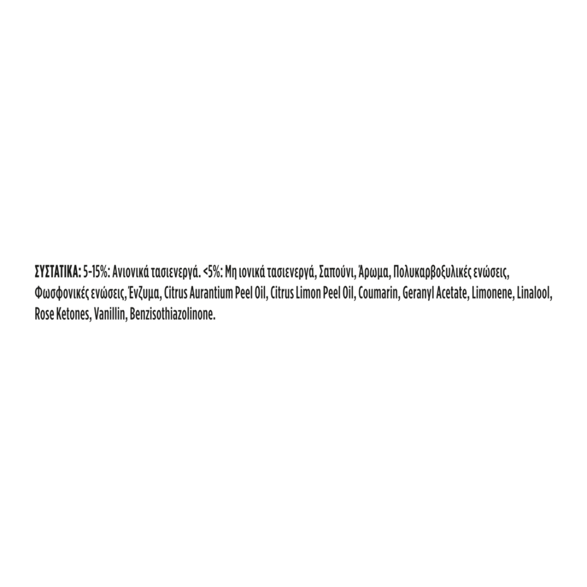 5-15%: Ανιονικά τασιενεργά.<5%: Μη ιονικά τασιενεργά, Σαπούνι, Άρωμα, Πολυκαρβοξυλικές ενώσεις, Φωσφονικές ενώσεις, Ένζυμα, Citrus Aurantium Peel Oil, Citrus Limon Peel Oil, Coumarin, Geranyl Acetate, Limonene, Linalool, Rose Ketones, Vanillin, Benzisothiazolinone.