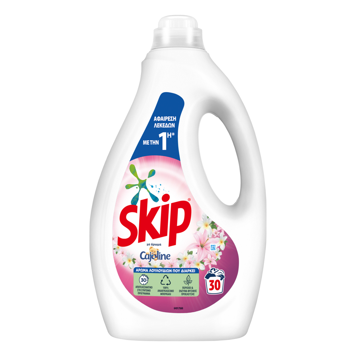 Το Skip με άρωμα Cajoline Λίλιουμ & Φρούτα του δάσους, προσφέρει στα ρούχα σας ασύγκριτη καθαριότητα και πλούσιο άρωμα ενώ αντιμετωπίζει τους δύσκολους λεκέδες από την πρώτη κιόλας πλύση. Είναι ιδανικό και χρωματιστά ρούχα καθώς δεν περιέχει λευκαντικούς παράγοντες στην σύνθεσή του. Είναι κατάλληλο απορρυπαντικό για καθημερινούς λεκέδες καθώς διαλύεται πιο εύκολα στην πλύση διεισδύοντας γρηγορότερα στην καρδιά του λεκέ.