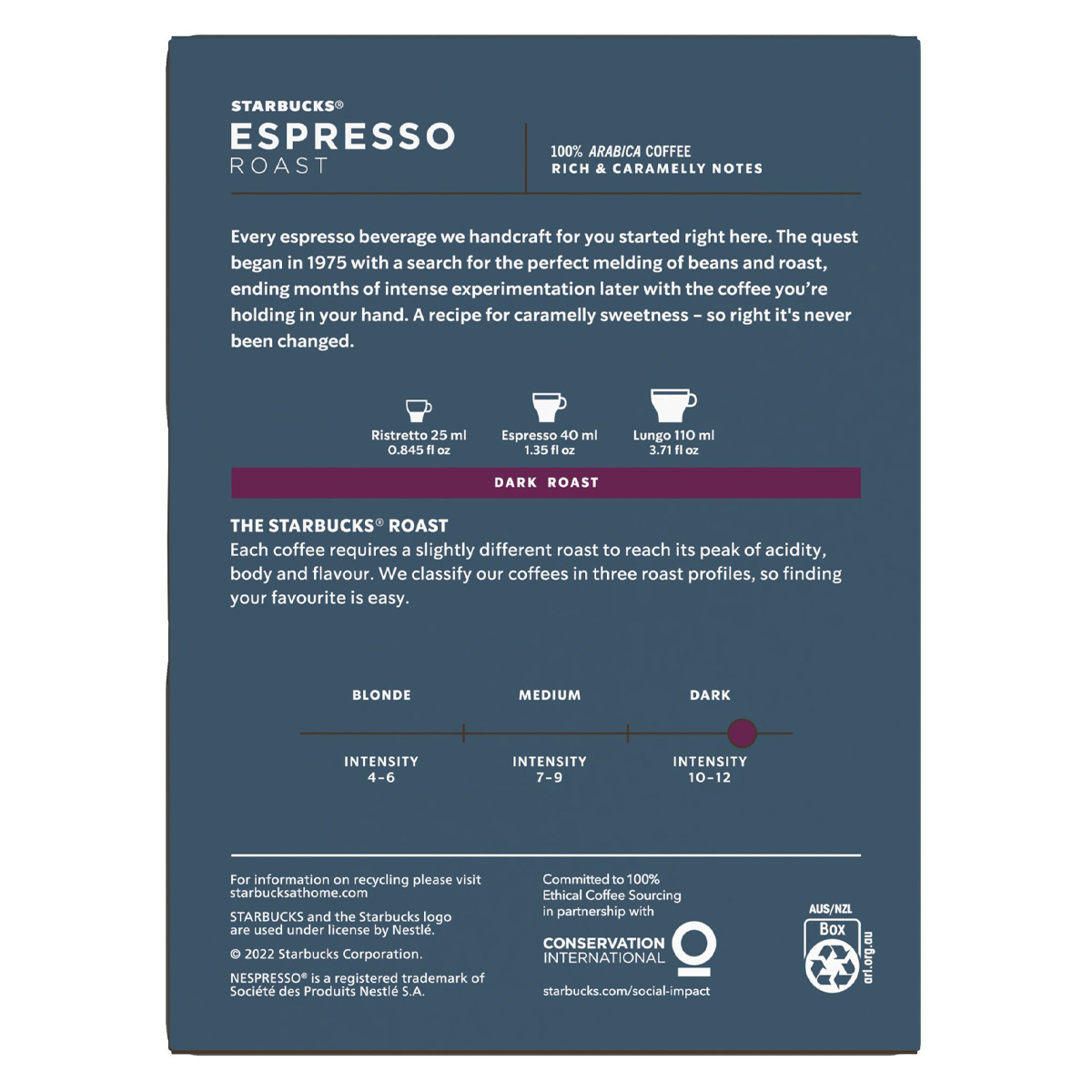 Κάθε ρόφημα με βάση τον espresso που σας φτιάχνουμε γεννιέται εδώ. Το 1975 ξεκίνησε η αναζήτηση για τον τέλειο συνδυασμό ποικιλιών καφέ και καβουρδίσματος και μετά από μήνες έντονων πειραματισμών, καταλήξαμε στον καφέ που κρατάτε στο χέρι σας. Μια συνταγή με νότες γλυκιάς καραμέλας, τόσο ιδανική που δεν έχει αλλαχθεί ποτέ. Σε μεγαλύτερη συσκευασία 18 καψουλών, περισσότερες κάψουλες, περισσότερες στιγμές με τον καφέ Starbucks®.Το αλουμίνιο μπορεί να ανακυκλωθεί ξανά και ξανά και ξανά. Συμβατές με μηχανή Nespresso.