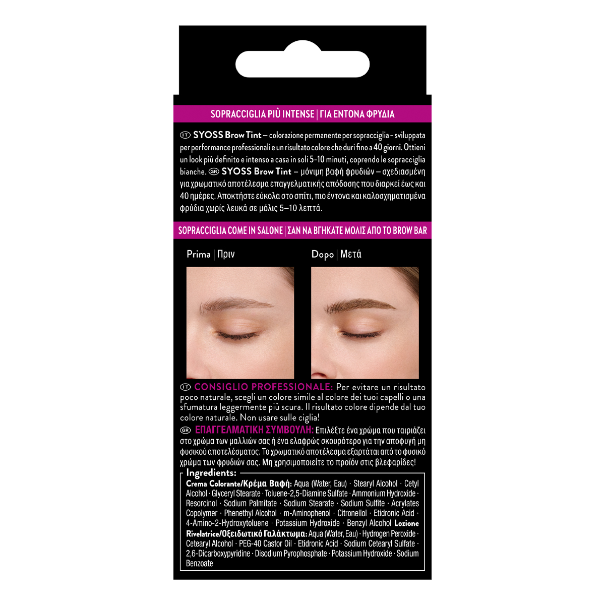 Οξειδωτικό Γαλάκτωμα: Aqua (Water, Eau), Hydrogen Peroxide, Cetearyl Alcohol, PEG-40 Castor Oil, Etidronic Acid, Sodium Cetearyl Sulfate, 2,6-Dicarboxypyridine, Disodium Pyrophosphate, Potassium Hydroxide, Sodium Benzoate.