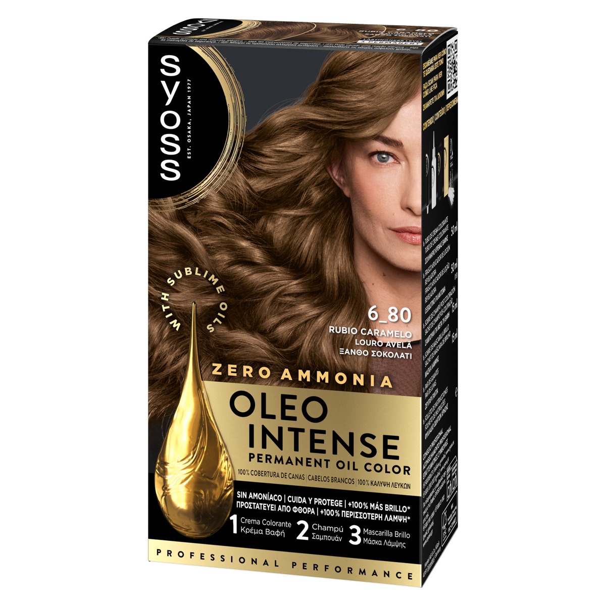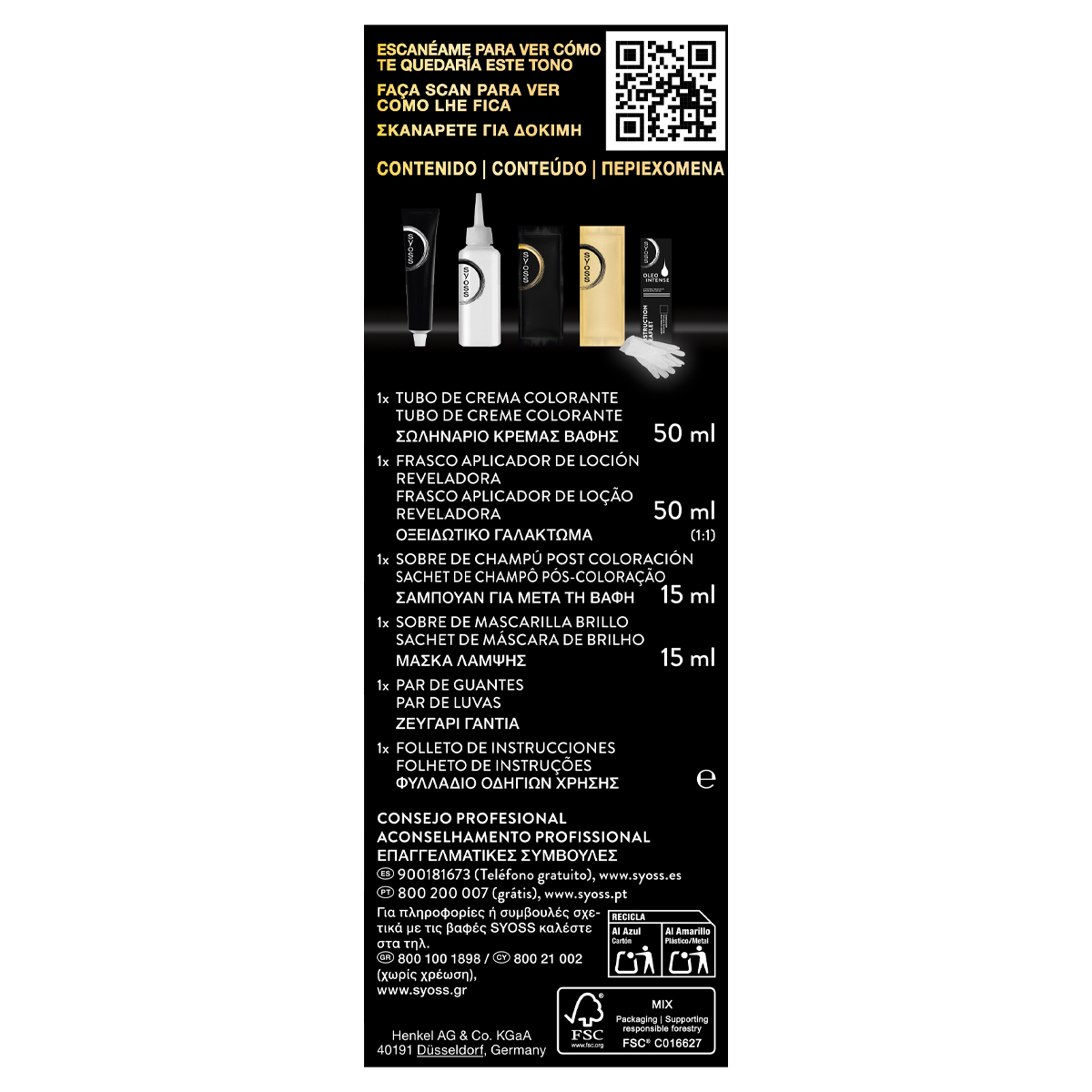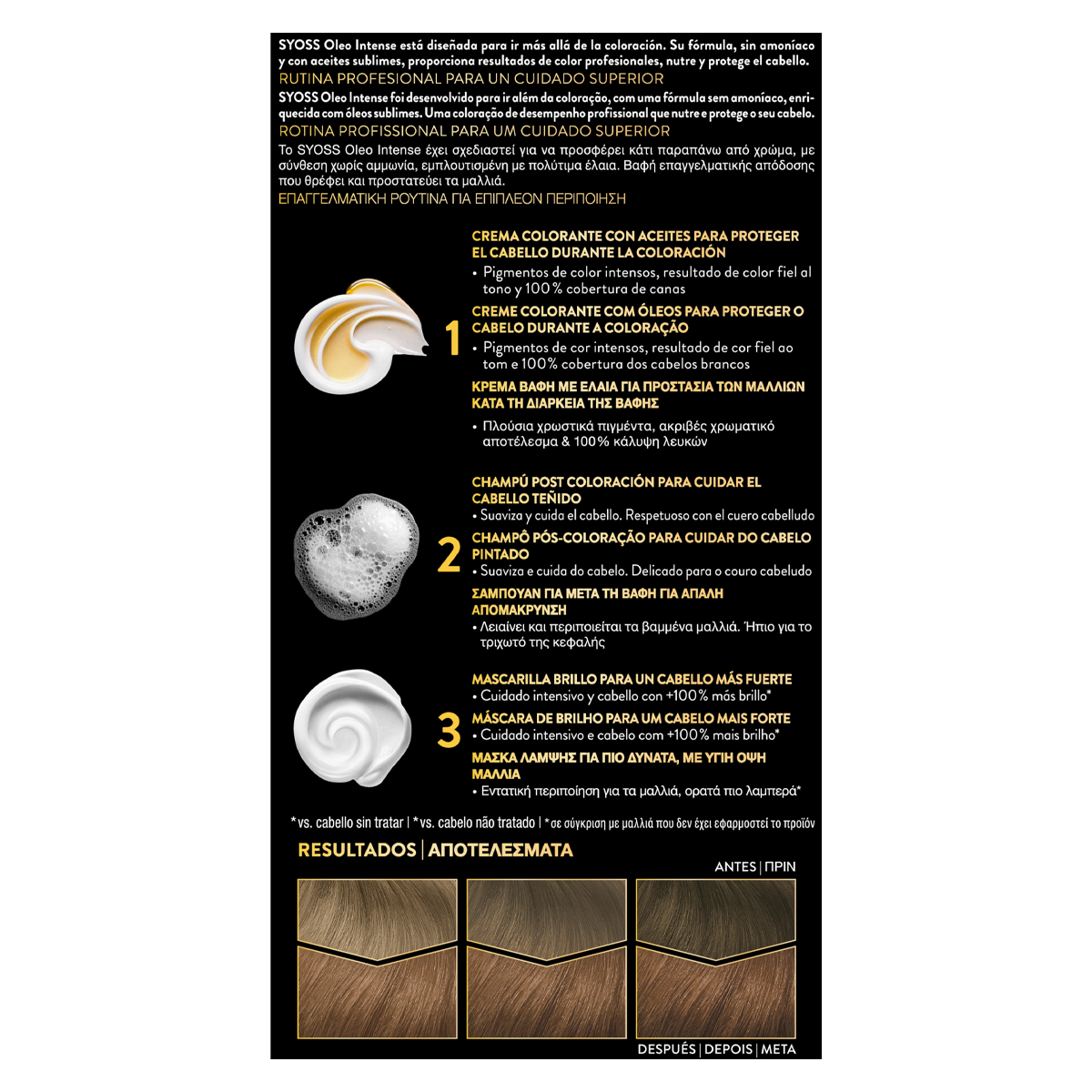 Syoss Oleo Intense Μόνιμη Κρέμα Βαφή Μαλλιών – χωρίς αμμωνία, εμπλουτισμένο με εκλεκτά έλαια Βαφή μαλλιών χωρίς αμμωνία που έχει σχεδιαστεί για να προσφέρει κάτι παραπάνω από χρώμα, με μια φόρμουλα χωρίς αμμωνία που περιέχει εκλεκτά έλαια. Θρέφει και προστατεύει τα μαλλιά σας, ενώ προσφέρει 100% κάλυψη λευκών. 1 - Κρέμα βαφή με έλαια για προστασία των μαλλιών κατά τη διάρκεια της βαφής: Πλούσια χρωστικά πιγμέντα, ακριβές χρωματικό αποτέλεσμα & 100 % κάλυψη λευκών 2 - Σαμπουάν για μετά τη βαφή για απαλή απομάκρυνση υπολειμμάτων χρώματος: Λειαίνει και περιποιείται τα βαμμένα μαλλιά. Ήπιο για το τριχωτό της κεφαλής 3 - Μάσκα λάμψης για πιο δυνατά με υγιή όψη μαλλιά. Εντατική περιποίηση για τα μαλλιά, ορατά πιο λαμπερά* *σε σύγκριση με μαλλιά που δεν έχει εφαρμοστεί το προϊόν Λεπτομέρειες προϊόντος. Χωρίς αμμωνία. Με εκλεκτά έλαια. 100% κάλυψη των λευκών. Προστασία από τη φθορά σε σύγκριση με μαλλιά που δεν έχει εφαρμοστεί το προϊόν.