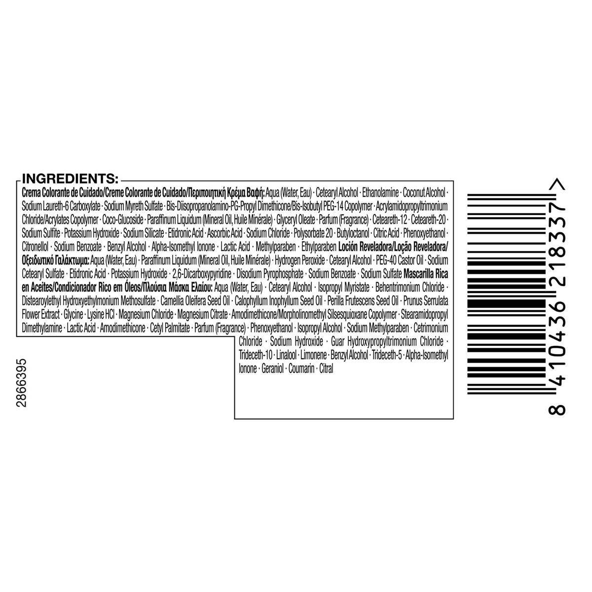 Hair Color/Toner, oxidative dyes:Aqua (Water, Eau),Cetearyl Alcohol,Ethanolamine,Coconut Alcohol,Sodium Laureth-6 Carboxylate,Sodium Myreth Sulfate,Glycine,Bis-Diisopropanolamino-PG-Propyl Dimethicone/Bis-Isobutyl PEG-14 Copolymer,Acrylamidopropyltrimonium Chloride/Acrylates Copolymer,Coco-Glucoside,Paraffinum Liquidum (Mineral Oil, Huile Minerale),Glyceryl Oleate,Parfum (Fragrance),Ceteareth-12,Ceteareth-20,Potassium Hydroxide,Sodium Sulfite,Sodium Silicate,Etidronic Acid,Ascorbic Acid,Sodium Chloride,Butyloctanol,Citric Acid,Polysorbate 20,Phenoxyethanol,Citronellol,Lactic Acid,Benzyl Alcohol,Alpha-Isomethyl Ionone,Sodium Benzoate,Methylparaben,Ethylparaben|:Aqua (Water, Eau),Cetearyl Alcohol,Quaternium-87,Propylene Glycol,Prunus Armeniaca (Apricot) Kernel Oil,Argania Spinosa Kernel Oil,Panthenol,Isopropyl Myristate,Distearoylethyl Hydroxyethylmonium Methosulfate,Citric Acid,Phenoxyethanol,Stearamidopropyl Dimethylamine,Polyquaternium-37,Ceteareth-20,Glyceryl Stearate,Sodium Methylparaben,Dicaprylyl Carbonate,Parfum (Fragrance),Hexyl Cinnamal,Benzyl Salicylate,Linalool,Lauryl Glucoside,Benzyl Alcohol,Limonene|Developer:Aqua (Water, Eau),Paraffinum Liquidum (Mineral Oil, Huile Minerale),Hydrogen Peroxide,Cetearyl Alcohol,PEG-40 Castor Oil,Sodium Cetearyl Sulfate,Etidronic Acid,Potassium Hydroxide,2,6-Dicarboxypyridine,Disodium Pyrophosphate,Sodium Benzoate,Sodium Sulfate.