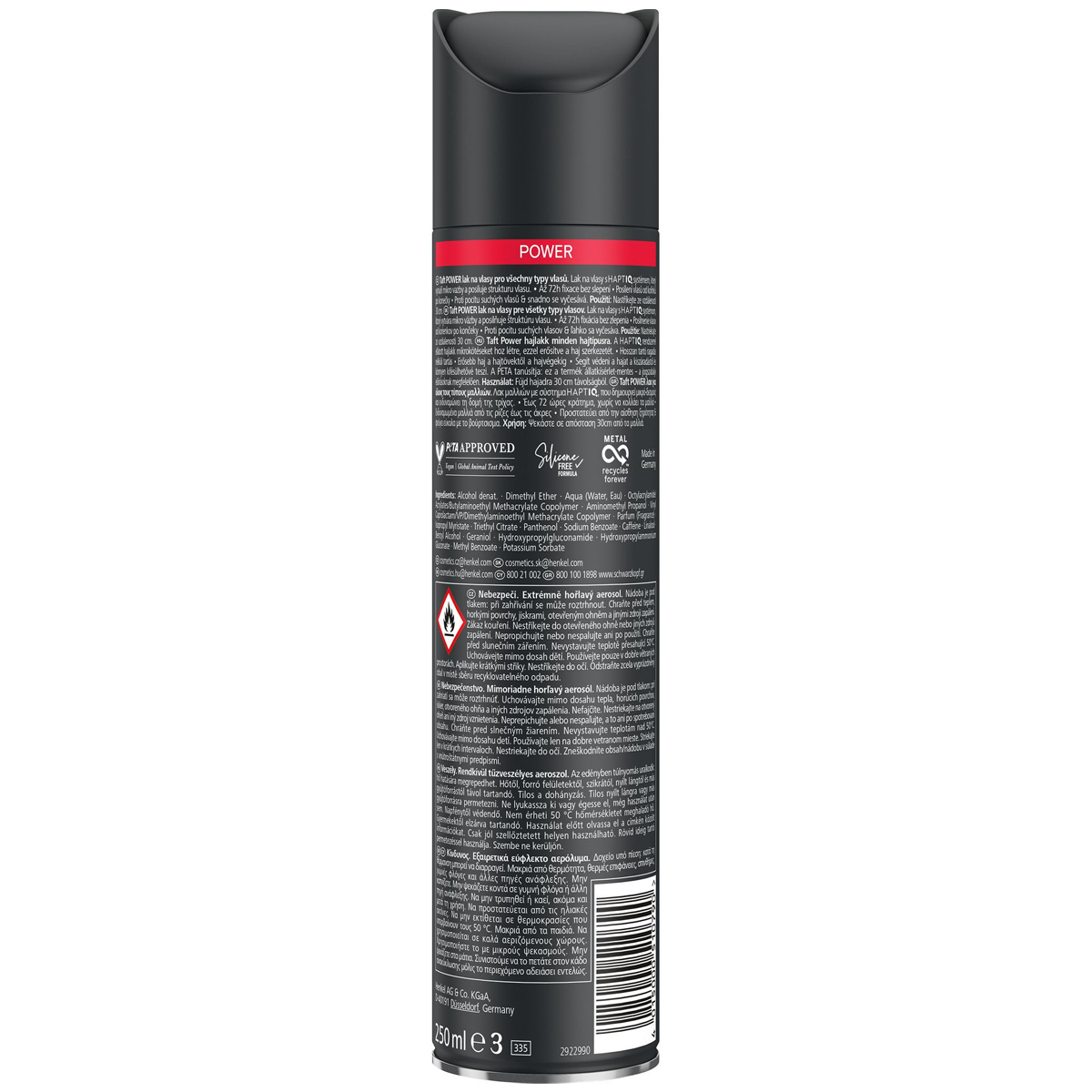 Η Taft Power λακ παρέχει κράτημα έως και 72 ώρες και δυναμώνει τα μαλλιά από τις ρίζες μέχρι τις άκρες. Για κράτημα που διαρκεί χωρίς να κολλάει τα μαλλιά, ενώ φεύγει εύκολα με το βούρτσισμα. Βοηθά στην προστασία των μαλλιών από την αίσθηση ξηρότητας ενώ προσφέρει στο χτένισμα styling με δυνατό κράτημα ακόμα και κάτω από καιρικές συνθήκες όπως η υγρασία και ο αέρας. Διαθέτει το σύστημα HAPTIQ, που δημιουργεί μικρό-δεσμούς και ενδυναμώνει τη δομή της τρίχας.