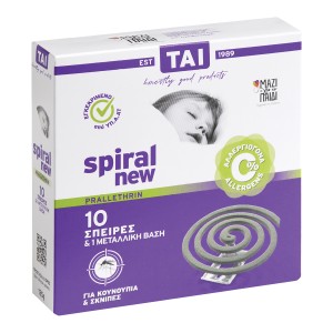 TAI New Spiral εντομοκτόνες σπείρες για προστασία ενάντια σε κουνούπια και σκνίπες . Περιέχει τη δραστική ύλη PRALLETHRIN που είναι μία σύγχρονη δραστική ουσία για την αποτελεσματική καταπολέμηση κουνουπιών & σκνιπών. Στην σύνθεσή τους δεν περιέχουν ΑΛΛΕΡΓΙΟΓΟΝΕΣ ουσίες (0%) (αριθμός έγκρισης κυκλοφορίας : ΥΠ.Α.Α.Τ ΤΠ18-0542).