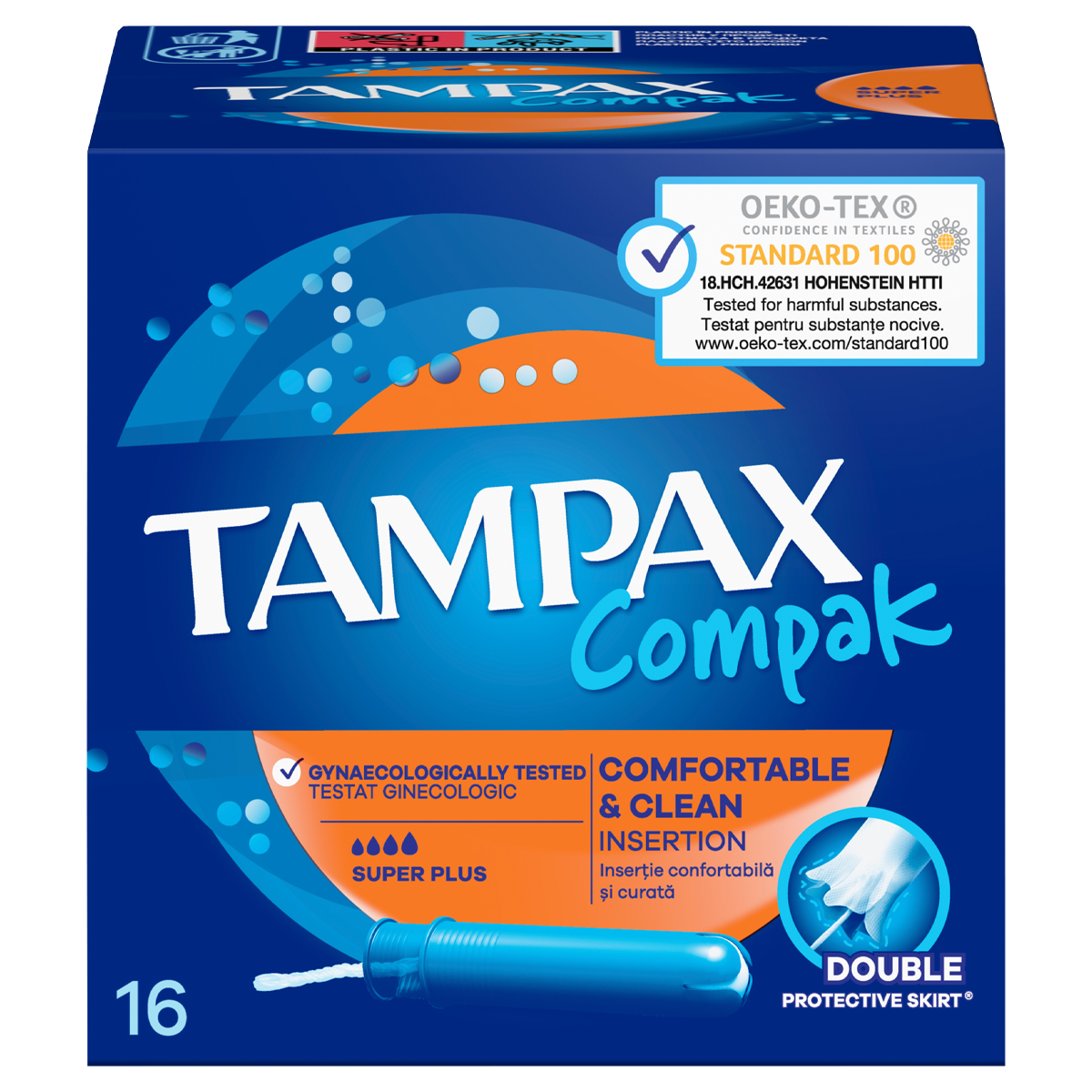 Τα ταμπόν Tampax Compak Super Plus προσφέρουν προστασία και διακριτικότητα για τις ημέρες με μεγάλη ροή κατά τη διάρκεια της περιόδου σας. Τα ταμπόν Tampax Compak προσφέρουν προστασία κατά την περίοδο σε πολύ πρακτική μορφή. Δεν περιέχουν αρώματα και χρωστικές. Τα ταμπόν Tampax Compak διαθέτουν ένα συμπαγές πλαστικό απλικατέρ με στρογγυλεμένο άκρο για άνετη εισαγωγή. Με κανάλια απορρόφησης που απορροφούν τα υγρά κατευθείαν στον πυρήνα και ένα διπλό κωνικό τελείωμα προστασίας που συμβάλλει στην αποφυγή διαρροών για περίοδο χωρίς έννοιες. Τα ταμπόν Tampax Compak είναι γυναικολογικά ελεγμένα. Έχουν επίσης εξεταστεί ανεξάρτητα για βλαβερές ουσίες και είναι πιστοποιημένα από το Πρότυπο 100 της Oeko-Tex. Απόλυτη προστασία από τις διαρροές που σας επιτρέπει να κάνετε ό,τι εσείς επιθυμείτε. Τα καλύτερα ταμπόν της σειράς Tampax Compak ιδανικά για μεγάλη ροή.Δοκιμάστε τα Tampax Pearl Compak, την καλύτερη επιλογή για άνεση και προστασία στη σειρά Tampax.Για περισσότερες πληροφορίες σχετικά με τα προϊόντα Tampax, επισκεφτείτε τον ιστότοπο της Tampax.