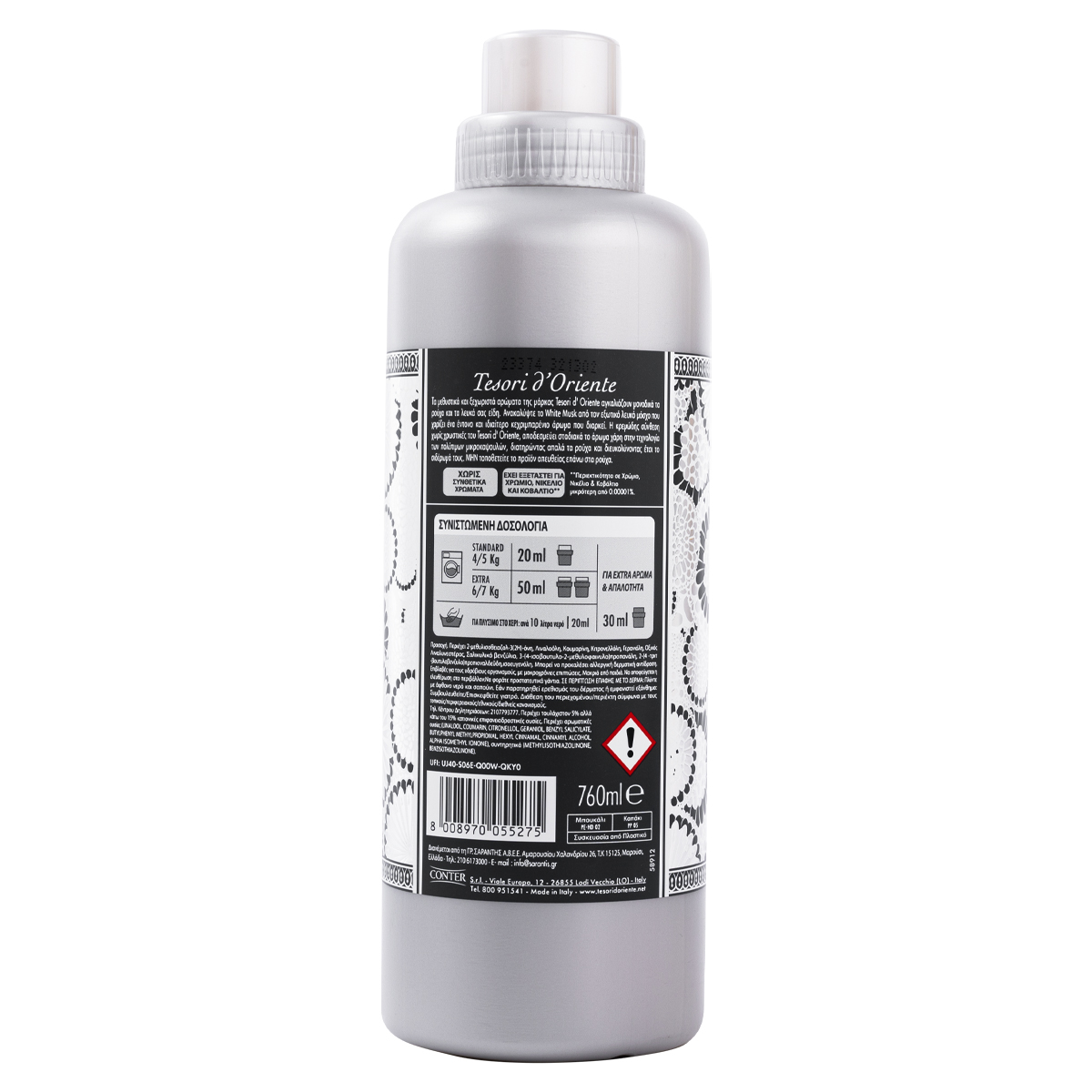 Τα μεθυστικά και ξεχωριστά αρώματα της μάρκας Tesori D'Oriente αγκαλιάζουν μοναδικά τα ρούχα και τα λευκά σας είδη. Ανακαλύψτε το White Musk από τον εξωτικό λευκό μόσχο που χαρίζει ένα έντονο και ιδιαίτερο κεχριμπαρένιο άρωμα που διαρκεί. Η κρεμώδης σύνθεση χωρίς χρωστικές του Tesori D'Oriente, αποδεσμεύει σταδιακά το άρωμα χάρη στην τεχνολογία των πολύτιμων μικροκαψουλών, διατηρώντας απαλά τα ρούχα και διευκολύντας έτσι το σιδέρωμα τους.
