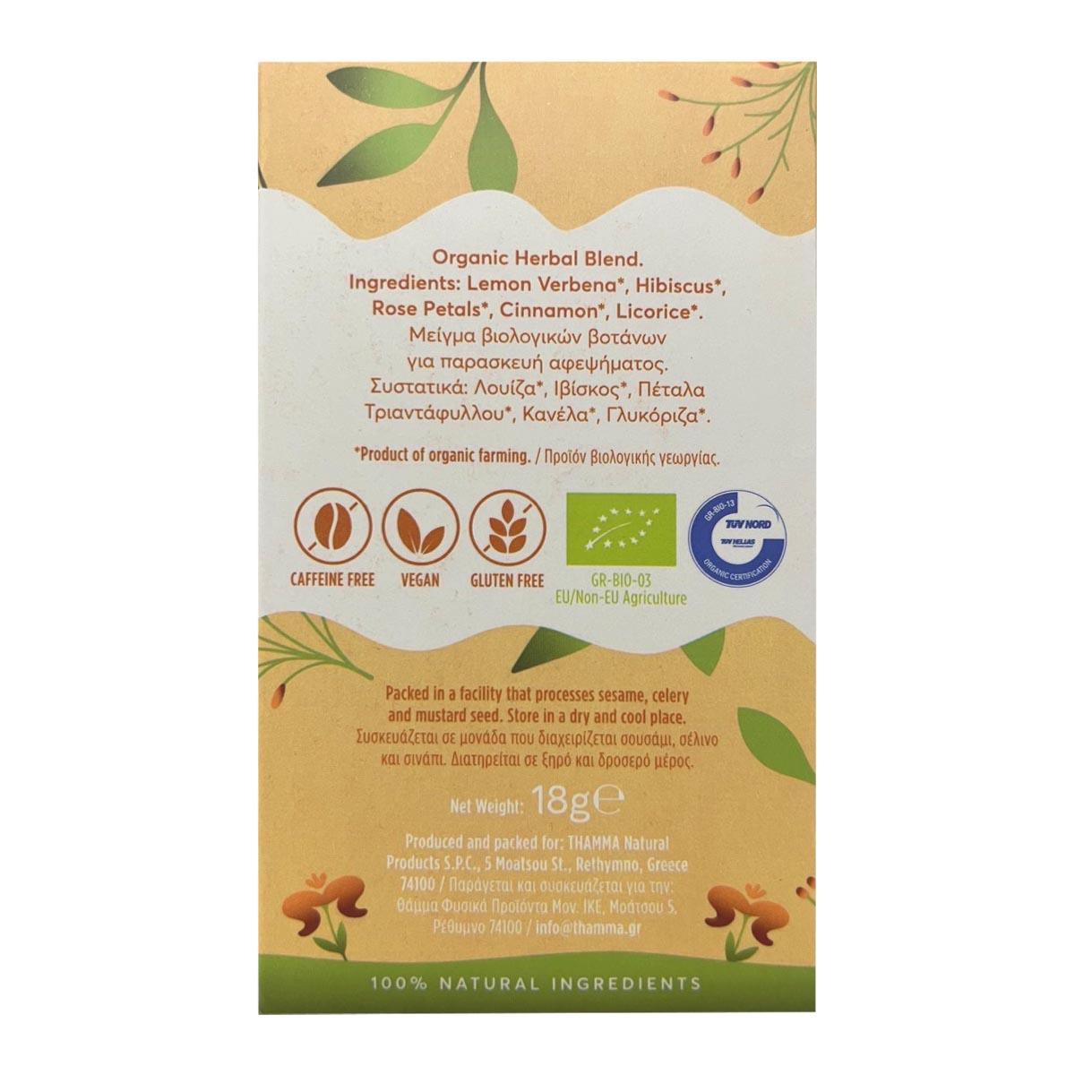 Απoλαύστε τις φυσικές αποτοξινωτικές ιδιότητες από την λουίζα και τον ιβίσκο μαζί με την ευχάριστη γεύση από τα πέταλα τριαντάφυλλου, την κανέλα και την γλυκόριζα.